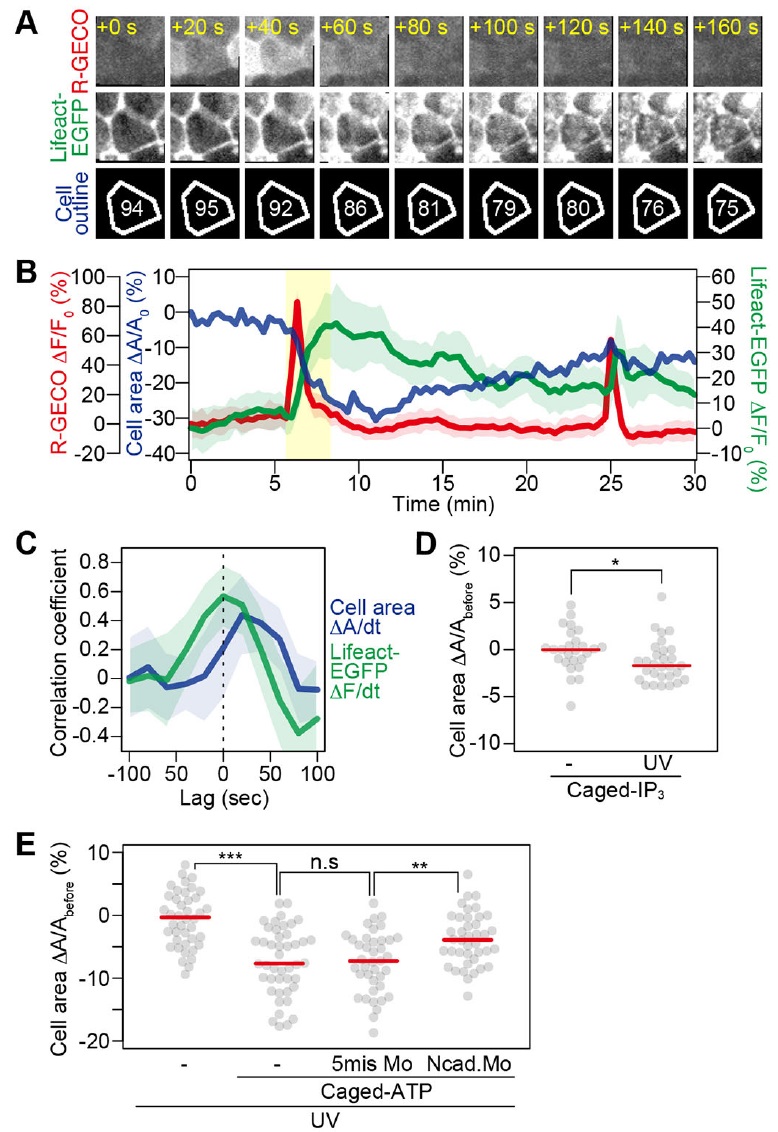 Fig. 5. Relationship between Ca2+ fluctuation and AC. (A) Dynamics of intracellular Ca2+ and F-actin at the single-cell level. An embryo expressing R-GECO1.0 (top) and Lifeact-EGFP (middle) was imaged during NTC. The numbers in the top panels (+0-160) indicate time (seconds) corresponding to the 340â500 s range in B (yellow in B). Numbers shown in the cell outlines (bottom) indicate the apical cell area (%) relative to that at time 0 in B. (B) Temporal profiles of the mean fluorescent intensities (δF/F0) of R-GECO1.0 (red) and medial Lifeact-EGFP (green), and the relative apical cell area (blue; δA/A0) in a single cell. The shaded areas indicate the s.d. The time period represented in A is highlighted in yellow. (C) Mean cross-correlation coefficients between the temporal dynamics of the apical cell area (blue), medial Lifeact-EGFP (green) and R-GECO1.0 (n=8 transients, 4 cells, 1 embryo). The shaded areas indicate s.d. (D) Relative apical cell area 50 s after photolysis of NPE-caged IP3 in the NP. Red line indicates the median value. *P<0.05, two-sided MannâWhitney U-test; n=26 cells, 2 embryos (âUV); 29 cells, 2 embryos (+UV). (E) Relative apical cell area 50 s after photolysis of DMNPE-caged ATP in the NP. Red line indicates the median value. **P<0.01 and ***P<0.001, two-sided MannâWhitney U-test; n=42 cells, 4 embryos (âDMNPE-caged ATP); 44 cells, 4 embryos (+DMNPE-caged ATP); 39 cells, 4 embryos (5mis-N-cadherin Mo; +DMNPE-caged ATP); 40 cells, 4 embryos (N-cadherin Mo; +DMNPE-caged ATP). 5mis, missense; Mo, morpholino; n.s., not significant. |