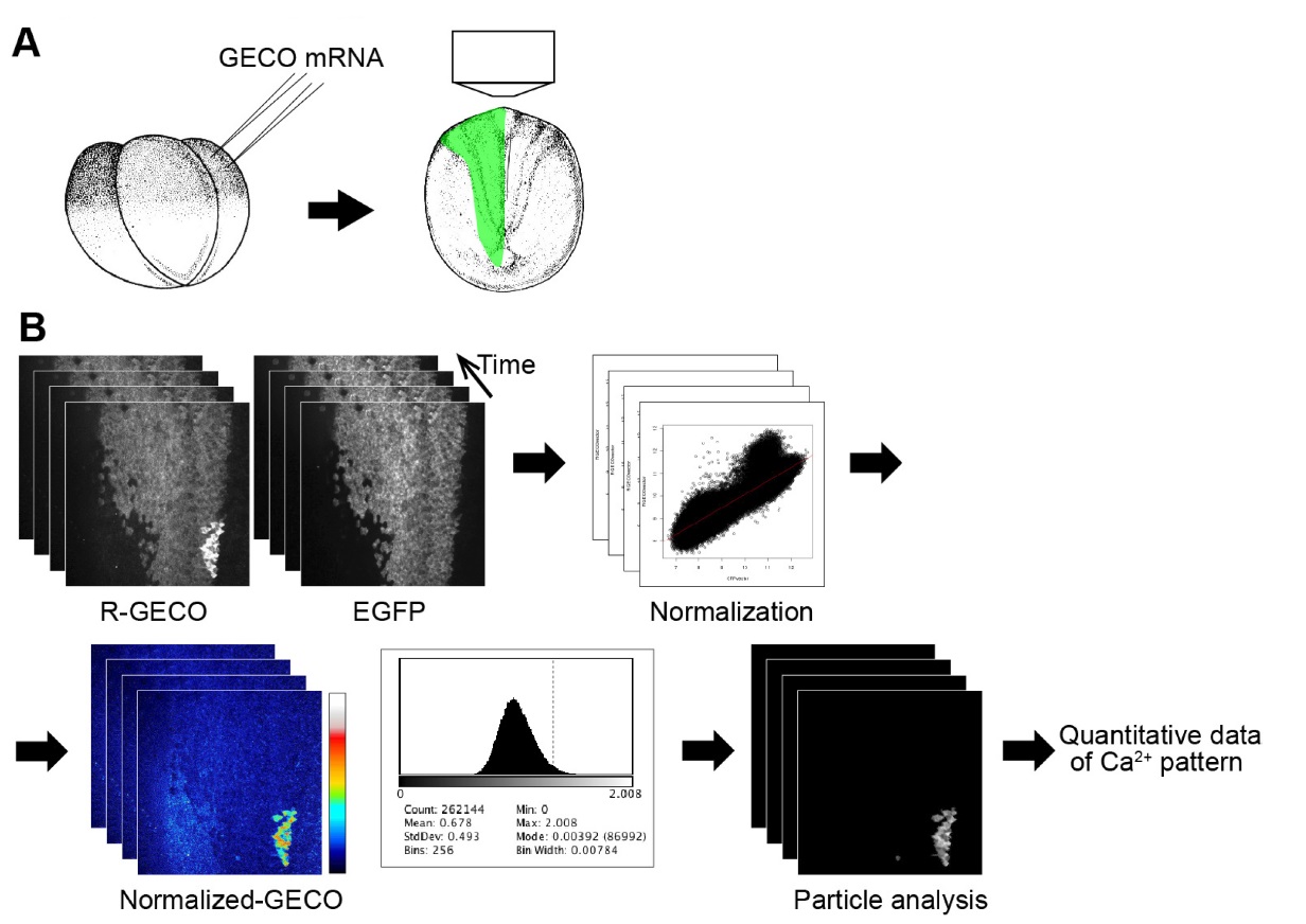 Figure S2. Method of the live-imaging analyses of neural tube closure. (A) Schematic of Xenopus embryo microinjection and confocal experiments. GECO RNAs were injected into the presumptive neural region in embryos at the four-cell stage. The embryos were then cultured to the appropriate developmental stage, after which the vitelline membranes were removed. The embryos were mounted in a hand-made agarose gel chamber on a glass-base dish filled with 0.3x MMR, and were observed by an inverted microscope equipped with a spinning-disk confocal unit and an EM-CCD camera. (B) Workflow for the quantitative imaging analyses of Ca2+ dynamics in the neural plate (see Materials and Methods for the detail.) |