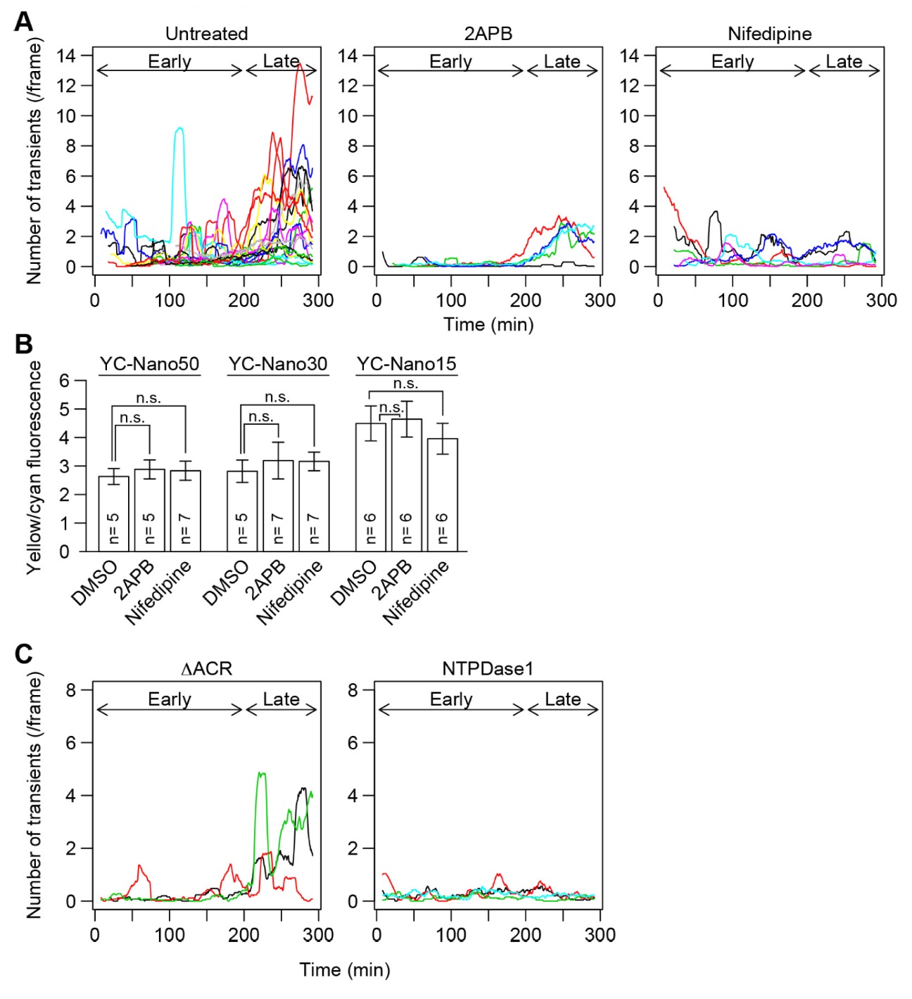 Figure S3. Supplementary profiles of Ca2+ fluctuation. (A) The number of Ca2+ transients occurring during NTC in the individual embryo shown in Fig. 3. Plots are shown as smoothed curves of the original counts by averaging values at a given time point with neighboring time points (50 time points total). (B) The mean yellow/cyan fluorescence ratio of the FRET-based Ca2+ indicators YC-Nano50, YC-Nano30, and YC-Nano15 in the neural plate in embryos treated with calcium-channel inhibitors. Error bars depict s.d. The number of embryos examined is shown on each bar. Statistical significances were assessed by two-sided Studentâs t test. (C) The number of Ca2+ transients during NTC in the embryo shown in Fig. 4. The plot is shown as smoothed curves obtained by averaging the originally counted numbers at a given time point with those of neighboring time points (25 time points total). |