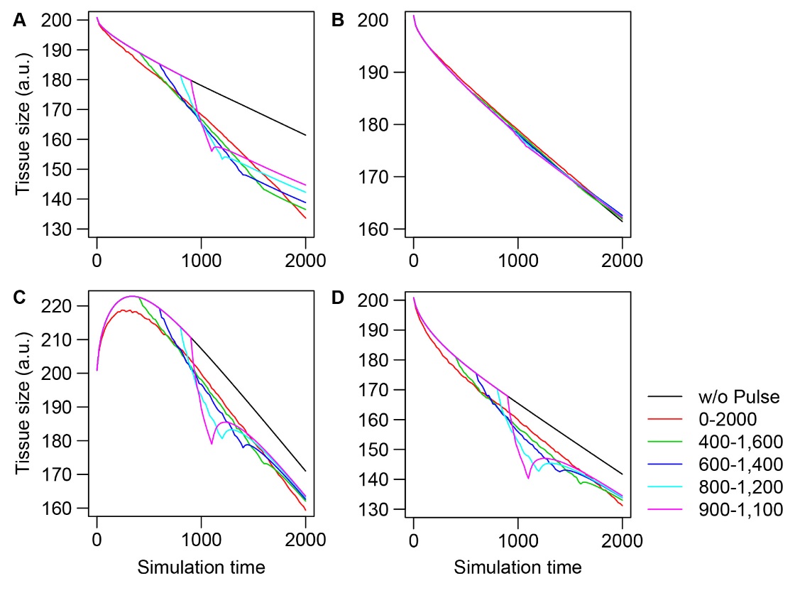 Figure S5. Mathematical analysis of pulsed apical constriction with varied assumptions. Mean tissue sizes of the modeled epithelial sheets during the time course of the simulations with the Acn component alone (black), and with the Acn components and the pulse whose active period was set from 200 to 2000 simulation times (colors). Basis of parameter values in the simulations is the same with Figure 7A (#2,4 in Table S2) and 7D (#43-46 in Table S2). (A) During the pulse, the coefficient of elasticity of cellâs apical surface area and perimeter are changed instead of the line tension; KA n = 0.2; KP n = 0.15. (B) Ï1 = -0.1; Ï2 = 0.1. (C) The cellsâ natural surface area and the cellsâ natural perimeter are permitted to increase: eq.7 and 8 were simplified to become dA0 n/dt = κA(An - ÏAA0 n) and dP0 n/dt = κp(Pn - ÏpP0 n); ÏA = 0.7; ÏP = 0.8. (D) The cellsâ natural surface area and the cellsâ natural perimeter are permitted to increase as shown in (C); ÏA = 0.8; ÏP = 0.7. |