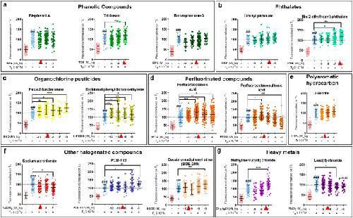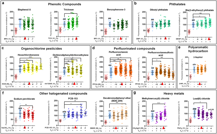 Figure 1. Thyroid disrupting activity of individual chemicals assessed with XETA.Screening of thyroid disrupting activity of molecules measured in humans with the Xenopus Embryonic Thyroid Assay (XETA), based on the quantification of fluorescence-using the transgenic TH/bZip-eGFP e.g. [(Tg(thibz:eGFP)] line. Fifteen compounds were tested at different concentrations in presence of T3 5âÃâ10â9âM for 72âh. Scattered plots are shown with mean +/â SD of three to five independent experiments pooled (normalised on T3 to 100%). The GFP fluorescence in whole tadpoles (mainly heads) was measured and quantified after 72âh exposure. (a) Phenolic compounds: BPA, Triclosan and Benzophenone-3. (b) Phthalates: DBP and DEHP. (c) Organochlorine pesticides: HCB and 4â²4-DDE. (d) Perfluorinated compounds: PFOA and PFOS. (e) Polyaromatic hydrocarbon: 2-Naphtol. (f) Halogenated compounds: Sodium perchlorate, PCB-153 and BDE-209. (g) Metals: Methylmercury and Lead chloride. Red arrowheads indicate concentrations of chemicals used in mix 1x (Table S1). Statistics were done with non-parametric Kruskal-Wallis test (*pâ<â0.05, **pâ<â0.01, ***pâ<â0.001, ****pâ<â0.0001). Hashes (###) represent pâ<â0.001, T3 vs Control using column to column comparison (non parametric Mann Whitney).