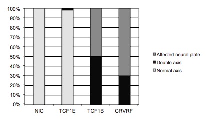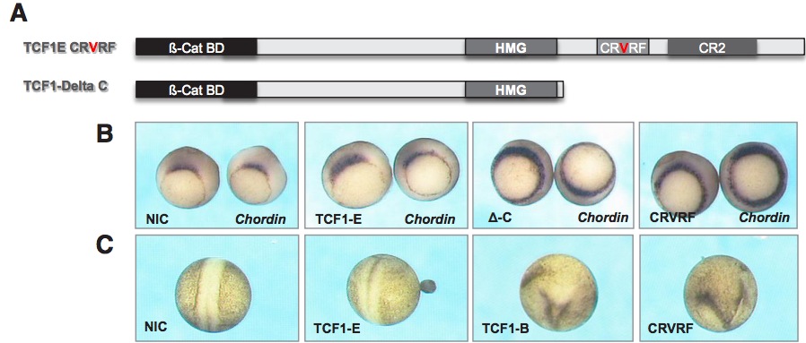 Fig. 3. Mutation of the C-clamp of XTcf-1E leads to a loss of isoform specificity. (A) XTcf1E-CRVRF holds a mutation in the C-clamp changing alanine into valine in the CR1 motif. XTcf1-deltaC has a premature stop codon directly 3â of the NLS. (B) Injection of 400 pg mRNA XTcf1- CRVRF induced ectopic dorsal mesoderm as indicated by the expansion of Chordin expression at the gastrula stage as does XTcf1-deltaC. (C,D) XTcf1E-CRVRF induces double axis formation in 29% of the injected embryos.