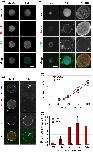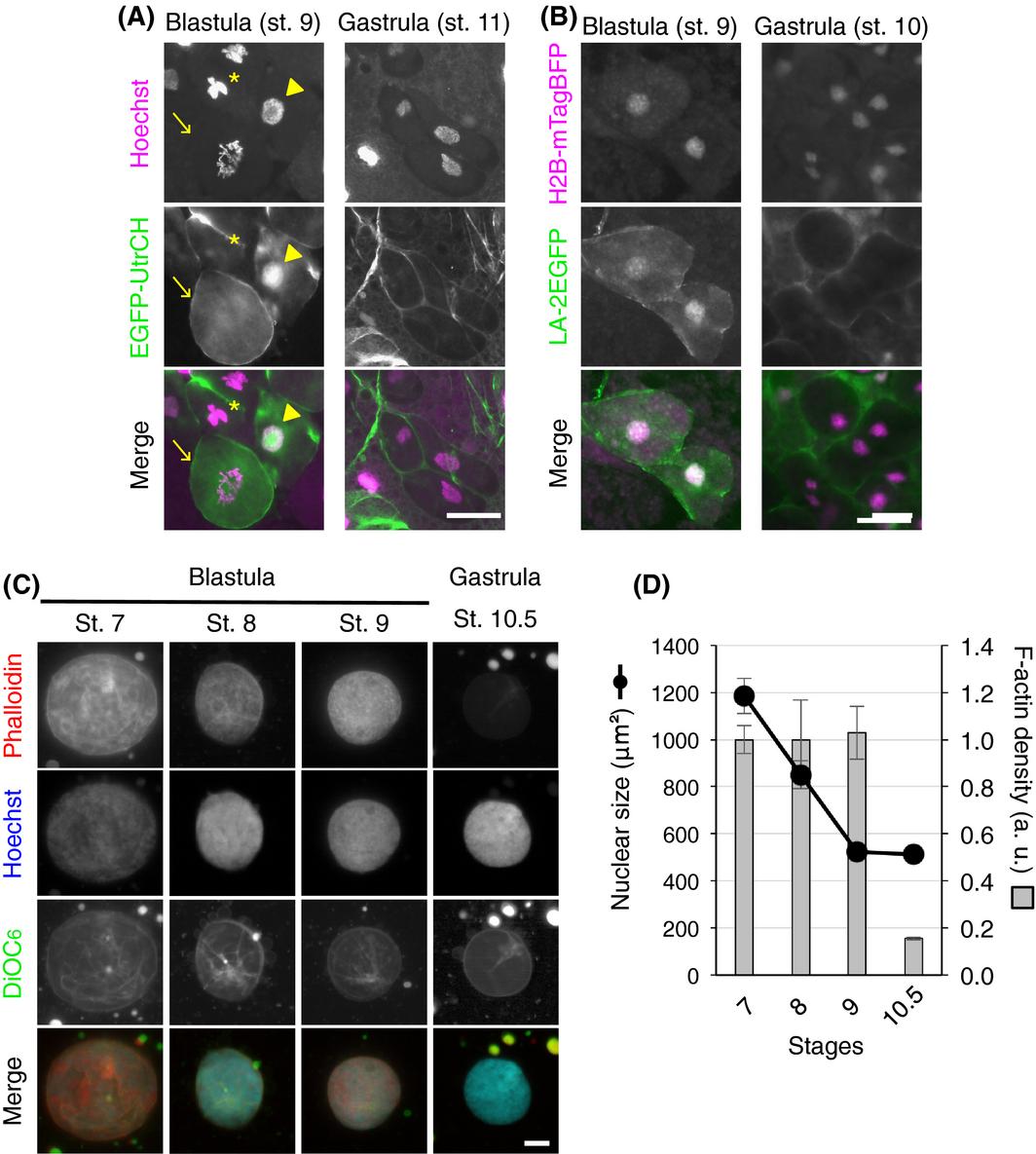 Figure 1.F-actin accumulates in the nucleus during the blastula stage. (A and B) Xenopus embryos were injected with EGFP-UtrCH (A) or LA-2EGFP and H2B-mTagBFP (B) mRNA and mounted on glass slides with Hoechst 33342 (A) or buffer (B) at the indicated stages before being gently squashed by a coverslip, followed immediately by observation by wide-field fluorescence microscopy. A nucleus accumulating EGFP-UtrCH, a mitotic blastomere and a blastomere at telophase is marked with arrowheads, arrows and asterisks, respectively. (A). Scale bar, 50 μm. (C) Nuclei were isolated from embryos at the indicated stages as described in Experimental Procedures. After fixation and staining of DNA, the nuclear envelope, and F-actin with Hoechst 33342, DiOC6, and DY-590-phalloidin, respectively, nuclei were observed by wide-field fluorescent microscopy. Representative images of each stage are shown. Scale bar, 10 μm. (D) Changes in nuclear size and F-actin density of embryo nuclei. Means for nuclear size and F-actin density were obtained by measuring the nuclear area stained with DiOC6 and the intensity of nuclear DY-590-phalloidin signal, respectively, on the nuclear images taken as described in (C) with original threshold using NIS-element BR software (Nikon). Error bars represent SE (n > 20). |