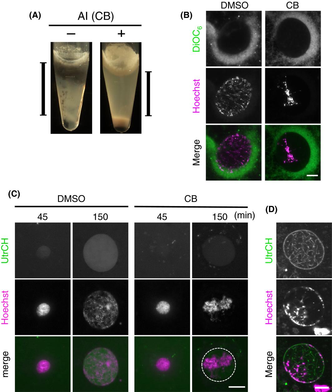 Figure 2. EGFP-UtrCH accumulates in nuclei formed in inhibitor-free egg extracts. (A) Centrifugal separation of the cytoplasm of Xenopus laevis eggs using cytochalasin B (CB)-containing (+) or CB-free (−) extraction buffer. Unfertilized Xenopus eggs were packed into a tube with buffer, and centrifugal separation was repeated twice as described in Experimental Procedures. In the absence of CB (−), a membranous layer containing pigment granules was formed beneath the lipid cap without clearly separating from the semitransparent cytoplasmic layer below. In the presence of CB (+), the semitransparent cytoplasmic layer was clearly separated from the lipid and membranous precipitates containing pigment granules. The cytoplasmic fractions between the lipid and precipitated membranes, which are indicated by bars, were removed and homogenized by pipetting for use as inhibitor-free (IFE) (−) and inhibitor-containing (ICE) (+) extracts. (B and C) AI-free (DMSO) and AI-containing (CB: cytochalasin B, 10 μg/mL) extracts were supplemented with permeabilized sperm (B) or those along with EGFP-UtrCH protein (C) and were activated by the addition of CaCl2. Nuclei at 3 h (B) or indicated time points (C) after incubation were observed by wide-field fluorescence microscopy with DNA (B, C) and the nuclear envelope (B) stained with Hoechst 33342 and DiOC6, respectively. The broken line in (C) indicates the nuclear contour. Scale bars, 20 μm. (D) Permeabilized sperm were added to IFE supplemented with EGFP-UtrCH protein and incubated for 120 min to induce nuclear formation. After Hoechst 33342 was added to the IFE, nuclei were observed without fixation by confocal microscopy as described in Experimental Procedures. Scale bar, 10 μm. |
