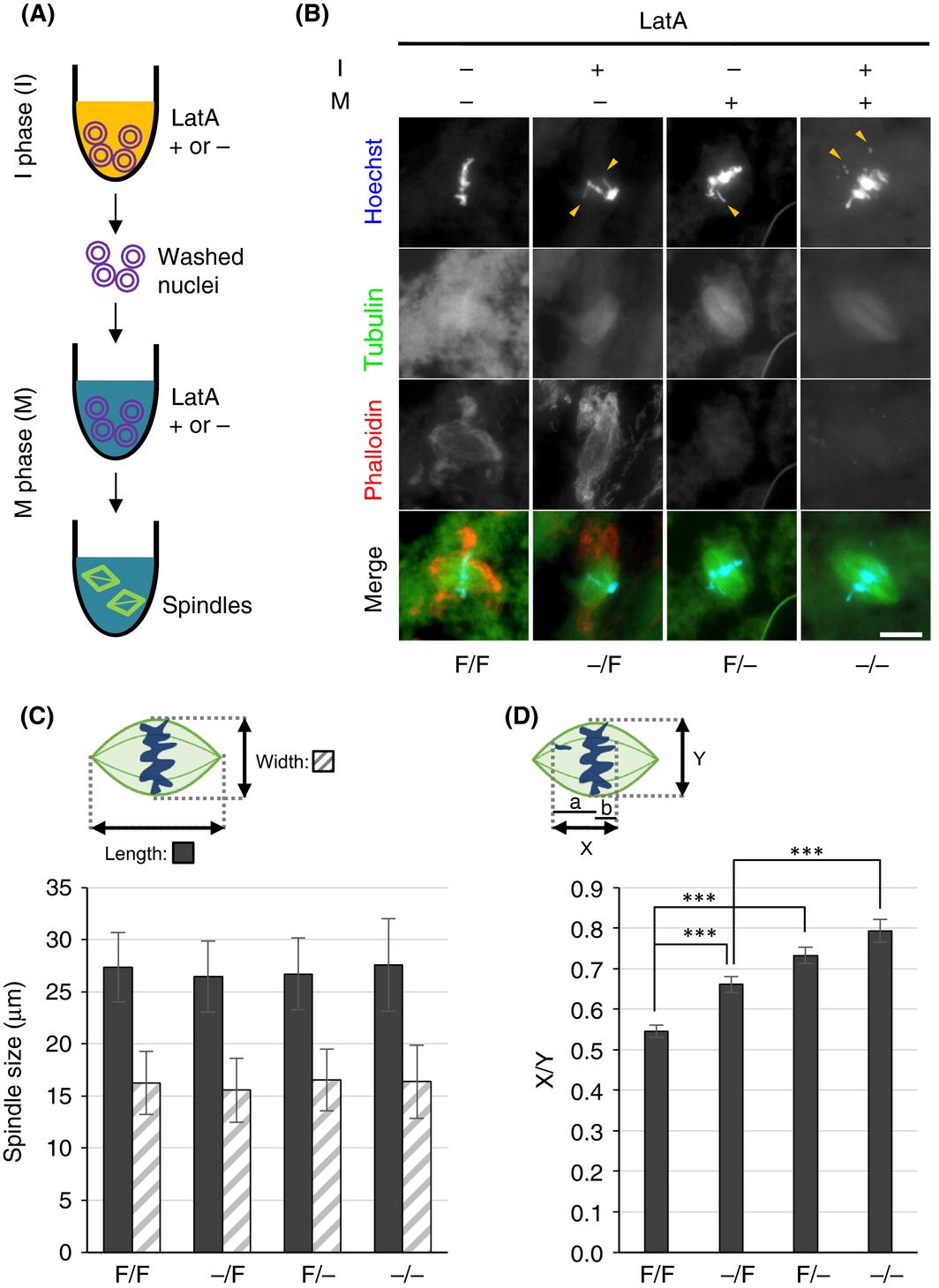 Figure 6. Nuclear F-actin facilitates chromosome alignment on the spindle. (A) Schematic of experiment to induce chromosome alignment on the spindle using egg extracts. Permeabilized sperm were incubated for 120 min in interphase IFE (I) supplemented with latrunculin A (LatA +) or DMSO (LatA −) to induce nuclear formation. After washing with extraction buffer, nuclei were incubated in M phase-arrested IFE (M) supplemented with latrunculin A (LatA +) or DMSO (LatA −) along with HiLyte Fluor 488-tubulin to induce spindle assembly. (B) Mitotic spindles assembled in M phase-arrested extracts were fixed and stained with Hoechst 33342 and DY-590-phalloidin and were observed by wide-field fluorescence microscopy. Presence (+) or absence of LatA (−) in interphase (I) and M phase-arrested (M) extracts is indicated at the top of the panel, and presence (F) or absence of F-actin (−) in egg extracts (I phase/M phase) is indicated at the bottom. Representative images of each experimental group are shown. Arrowheads indicate misaligned chromosomes. Scale bar, 20 μm. (C) Spindle sizes. Lengths (black bars) and widths (hatched bars) of at least 150 spindles were measured for each of the four groups in (B). Bars and error bars represent means and SD, respectively. (D) Chromosome distribution area on spindles. The width (Y) and the length of chromosome distribution area (X = a + b) were measured on each of the spindles examined in (C). The extent of chromosome alignment is expressed as the ratio of X to Y (X/Y). Bars and error bars represent means and SE, respectively. ***P < 0.001. |