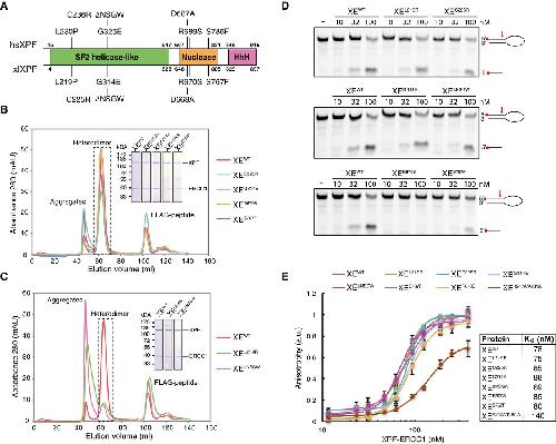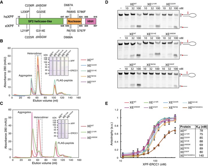 Fig. 1. Characterization of mutant XPFâERCC1 complexes. A. Schematic representation of the domain organization of the XPF protein. Domain boundaries of human and Xenopus laevis XPF are indicated. Relevant mutations of the human protein, and the Xenopus laevis equivalents, are indicated on top and bottom, respectively. B. Superdex 200 gel filtration column elution profile of wildâtype XPFâERCC1 and indicated mutant complexes. Aggregates eluted in the void volume of the column (Ë45 ml) while the active XPFâERCC1 heterodimer eluted at Ë65 ml. The peak eluting at Ë105 ml contains the FLAG peptide used to elute the protein from the FLAG affinity resin. The heterodimer peak was isolated, and proteins were separated on SDSâPAGE and stained with Coomassie blue (inset). C. As in (B) but for different mutant complexes that showed more aggregation. D. Wildâtype and indicated mutant XPFâERCC1 complexes were incubated with a 5â²âFAMâlabeled stemâloop DNA substrate (10 nM) at room temperature for 30 min. Reaction products were separated on a 12% ureaâPAGE gel and visualized using a fluorescence imaging system. Red arrow indicates position of incision by XPFâERCC1. E. Wildâtype and mutant XPFâERCC1 complexes at various concentrations were incubated with a 5â²âFAMâlabeled 3â² flap DNA substrate (10 nM) and fluorescent anisotropy was measured. Graphs were fitted to calculate dissociation constants (Kds) as described in the Materials and Methods section. The error bars represent s.d. from three measurements. Experimental replicates are shown in Fig EV2. Source data are available online for this figure. |