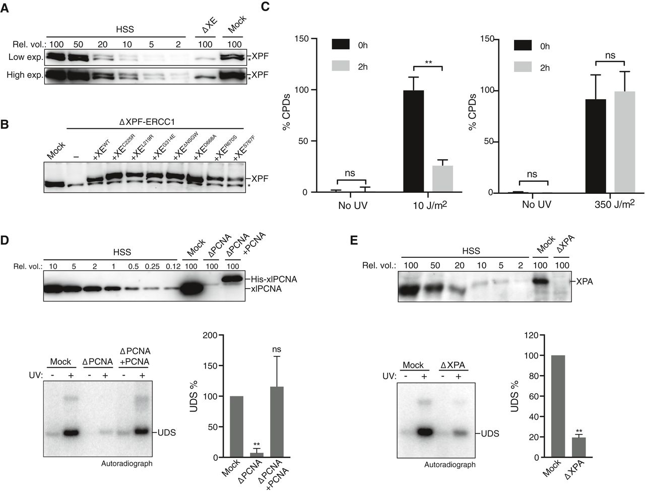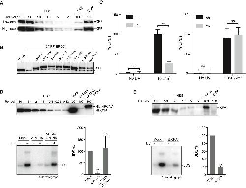Figure EV4. XPF‐ERCC1 mutant complexes are active in NER Mock‐depleted and XPF‐ERCC1‐depleted (ΔXE) high‐speed supernatant (HSS) egg extracts used in Fig 3B were analyzed by Western blot using α‐XPF antibodies. A dilution series of undepleted NPE was loaded on the same blot to determine the degree of depletion. A relative volume of 100 corresponds to 0.2 μl of NPE. *, background band. Mock‐depleted, XPF‐ERCC1‐depleted (ΔXE), and XPF‐ERCC1‐depleted HSS complemented with wild‐type (XEWT) or mutant XPF‐ERCC1 (XEMUT) were analyzed by Western blot using α‐XPF antibodies. *, background band. Untreated or UV‐treated (10 J/m2, left panel, 350 J/m2 right panel) plasmid DNA was incubated in HSS for 2 h. Samples were taken at time 0 and 2 h, and DNA was extracted and analyzed by an enzyme‐linked immunosorbent assay (ELISA) for the presence of CPDs. The highest value within one experiment was set to 100%. Error bars represent s.e.m. of three independent experiments. **P = 0.0061, paired t‐test. ns, not significant. Mock‐depleted, PCNA‐depleted (ΔPCNA), and PCNA‐depleted HSS complemented with recombinant His‐xlPCNA (ΔPCNA + PCNA) were analyzed by Western blot using α‐PCNA antibodies (Kochaniak et al, 2009). A dilution series of undepleted NPE was loaded on the same blot to determine the degree of depletion. A relative volume of 100 corresponds to 0.2 μl of NPE (top panel). These extracts were incubated with untreated or UV‐treated (350 J/m2) plasmids for 0 or 2 h at room temperature in the presence of 32P‐α‐dCTP. Reaction products were isolated, linearized with HincII, and separated on a 0.8% agarose gel. The DNA was visualized by autoradiography to show incorporation of 32P‐α‐dCTP during UDS (bottom left panel). The signal was quantified, the background signal from non‐damaged plasmid was subtracted, and the signal for the mock depletion condition was set to 100% to normalize the data. Error bars represent s.e.m. of three independent experiments. **P = 0.0059, paired t‐test compared to the mock condition. ns, not significant. As in (D) but using mock‐depleted or XPA‐depleted HSS. **P = 0.0014. Source data are available online for this figure. |