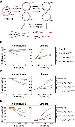 Figure 4. XPF‐ERCC1 separation‐of‐function mutants are all defective in ICL unhooking A. Schematic representation of the assay used to directly measure unhooking incisions. 32P‐labeled parental stands are indicated in red. Products before and after ICL unhooking during repair are indicated. HincII digestion of repair intermediates yields X‐structures, arms, and linears under denaturing conditions. B. XPF‐ERCC1‐depleted (ΔXE) or XPF‐ERCC1‐depleted egg extract complemented with wild‐type (XEWT) or mutant XPF‐ERCC1 (XEMUT) were incubated with pre‐labeled pICL. Repair products were isolated at indicated times, linearized with HincII, separated on a denaturing agarose gel, and visualized by autoradiography. The X‐structures and linear products were quantified and plotted. C, D As in (B) but using different XPF‐ERCC1 mutant complexes. Experimental replicates are shown in Appendix Fig S1. |