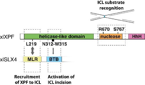 Figure 7. Model for ICL repair‐specific features of XPF Leucine 219 in the helicase‐like domain of XPF is essential for the interaction of XPF with the MLR domain of SLX4. This interaction mediates the recruitment of XPF to an ICL. Residues 312–315 transiently interact with the BTB domain of SLX4 and are required for the incisions of an ICL by XPF. Arginine 670 and serine 767 in the nuclease domain of XPF are crucial for the recognition of the ICL substrate. |