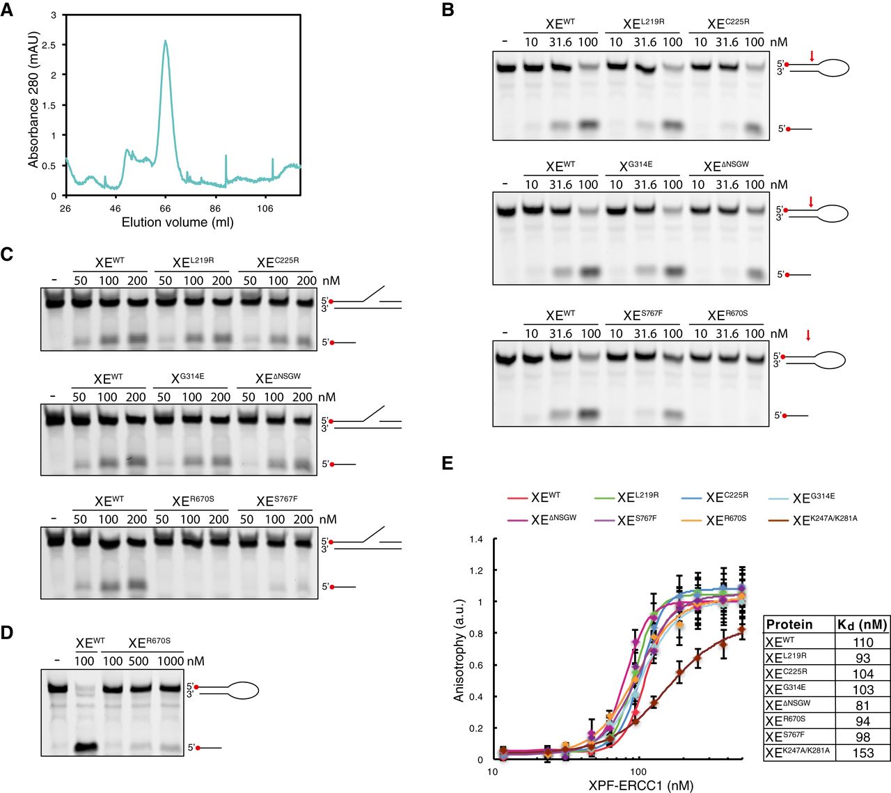 Figure EV2. Characterization of mutant XPF‐ERCC1 complexes A. Superdex 200 gel filtration column elution profile of XPFL219R‐ERCC1. The heterodimeric fraction depicted in Fig 1A was collected, concentrated, and rerun on the same column. The protein did not aggregate and eluted as a heterodimer at ˜65 ml. B. Replicate of Fig 1D. Wild‐type and indicated mutant XPF‐ERCC1 complexes were incubated with a 5′‐FAM‐labeled stem‐loop DNA substrate (10 nM) at room temperature for 30 min. Reaction products were separated on a 12% urea–PAGE gel and visualized using a fluorescence imaging system. Red arrow indicates position of incision by XPF‐ERCC1. C. As in (B) but using a 5′‐FAM‐labeled 3′ flap DNA substrate. D. As in (B) but using higher concentrations of the XER670S mutant. E. Replicate of Fig 1E. Wild‐type and mutant XPF‐ERCC1 complexes at various concentrations were incubated with a 5′‐FAM‐labeled 3′ flap DNA substrate (10 nM) and fluorescent anisotropy was measured. Graphs were fitted to calculate dissociation constants (Kds) as described in the Materials and Methods section. The error bars represent s.d. from three measurements. Source data are available online for this figure. |