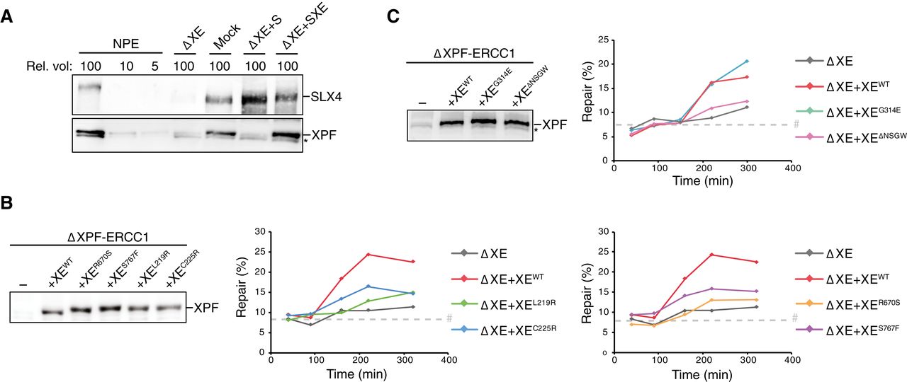 Figure EV3. Effect of mutations in XPF‐ERCC1 on ICL repair in Xenopus egg extract Mock‐depleted, XPF‐ERCC1‐depleted (ΔXE), and XPF‐ERCC1‐depleted NPE complemented with SLX4 (ΔXE+S) or XPF‐ERCC1 and SLX4 (ΔXE+SXE) were analyzed by Western blot using α‐XPF or α‐SLX4 antibodies. A dilution series of undepleted NPE was loaded on the same blot to determine the degree of depletion. A relative volume of 100 corresponds to 0.2 μl of NPE. Replicates of Fig 2B. XPF‐ERCC1‐depleted (ΔXE) and XPF‐ERCC1‐depleted extracts complemented with wild‐type (XEWT) or indicated mutant XPF‐ERCC1 (XEMUT) were analyzed by Western blot using α‐XPF antibodies (left panel). These extracts were used to replicate pICL. Replication intermediates were isolated and digested with HincII, or HincII and SapI, and separated on an agarose gel. Repair efficiency was calculated and plotted (right panels). As in (B) but analyzing different mutant complexes. Note: repair levels can differ per batch of individually prepared extract or per depletion experiment and can only be compared within an experiment. Data information: (B, C) #, SapI fragments from contaminating uncrosslinked plasmid present in varying degrees in pICL preparations. (A, C) *, background band. Source data are available online for this figure. |