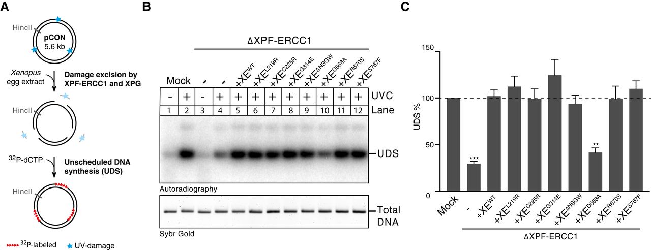 Figure 3. XPF‐ERCC1 mutant complexes are active in nucleotide excision repair (NER) Schematic representation of unscheduled DNA synthesis (UDS) during NER on a UV‐treated template in high‐speed supernatant (HSS) egg extract. Mock‐depleted, XPF‐ERCC1‐depleted (ΔXE), and XPF‐ERCC1‐depleted extracts complemented with wild‐type (XEWT) or mutant XPF‐ERCC1 (XEMUT) were incubated with untreated or UV‐treated plasmids for 2 h at room temperature in the presence of 32P‐α‐dCTP. Reaction products were isolated, linearized with HincII, and separated on a 0.8% agarose gel. The DNA was visualized by autoradiography to show incorporation of 32P‐α‐dCTP during UDS (upper panel) and stained with SYBR gold for total DNA (lower panel). The incorporation of 32P‐α‐dCTP was quantified, the background signal from non‐damaged plasmid was subtracted, and the signal for the mock depletion condition was set to 100% to normalize the data. Error bars represent s.e.m. of three independent experiments. **P = 0.003, ***P = 0.0004, paired t‐test comparing all conditions to the mock. All non‐marked conditions did not show a statistical difference from the mock condition. Source data are available online for this figure. |