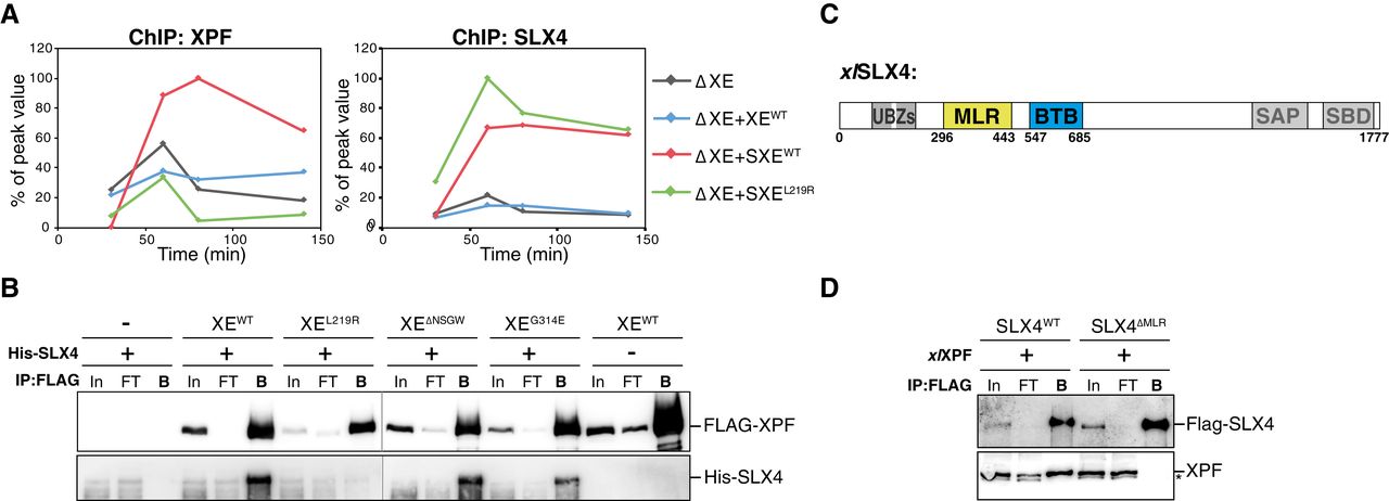 Figure 6. XPF leucine 219 is part of the major interaction site between XPF and SLX4 pICL was replicated in XPF‐ERCC1‐depleted (ΔXE) extract or in XPF‐ERCC1‐depleted extract supplemented with wild‐type XPF‐ERCC1 only (+XEWT), wild‐type XPF‐ERCC1 and SLX4 (+SXEWT), or XPFL219R‐ERCC1 and SLX4 (+SXEL219R; see Fig EV5A). Samples were taken at the indicated times and immunoprecipitated with α‐XPF (left panel) or α‐SLX4 antibodies (right panel). Co‐precipitated DNA was isolated and analyzed by quantitative PCR using ICL or pQuant primers. The qPCR data were plotted as the percentage of peak value with the highest value set to 100%. Wild‐type and mutant FLAG‐XPF‐ERCC1 were co‐expressed with His‐SLX4 in Sf9 insect cells. Cells were lysed and XPF was immunoprecipitated via the FLAG‐tag. Samples were analyzed by Western blot using α‐FLAG and α‐His antibodies. In, input; FT, flow‐through fraction; B, fraction bound to beads. Schematic representation of xlSLX4 proteins, with the MLR and BTB domains indicated. Experimental replicates are shown in Fig EV5. Purified wild‐type FLAG‐SLX4 and FLAG‐SLX4∆MLR were added to Xenopus egg extract. SLX4 was immunoprecipitated via the FLAG‐tag. Samples were analyzed by Western blot using α‐FLAG and α‐XPF antibodies. Line within blot indicates position where irrelevant lanes were removed. *, background band. Source data are available online for this figure. |