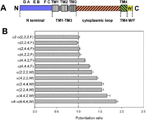 Fig 2. Chimeric subunits used to determine regions contributing to potentiation by βEST.Panel A shows a linear cartoon of a nicotinic subunit, with the amino-terminus (“N”) at the left. Some major structural features are indicated: in the amino-terminal extracellular domain there are 6 domains involved in agonist binding, the A, B, C loops contributed by the α subunit and the D, E, F loops contributed by the β subunit. The 4 transmembrane regions are indicated by the enlarged boxes; the channel is formed by TM2 helices contributed by the 5 subunits in the receptor. The 4 regions studied were the N-terminal domain (blue; extending from the amino-terminus to V(210)IRRLP sequence at the start of TM1 (the amino acid residue numbering is for the mature α4 subunit; NCBI Reference Sequence: NP_000735.1). The TM1-TM3 regions (gray with vertical hatching) are identical in the mouse α2 and human α4 subunits. The region called the cytoplasmic loop (red with forward hatching) extends from N(301)VHHRSP at the end of TM3 to D(571)RIFL at the start of TM4. TM4 (green with backwards hatching) is the region from D(571)RIFL to FLP(592)P. The tryptophan in α4 is in the carboxy-terminal region, W(594)LAGMI. The cytoplasmic loop is highly divergent in nicotinic subunits, and contains between about 150 and 270 amino acids. Panel B shows the mean potentiation ratio for the chimeras studies. Chimeras are identified by which subunit contributed the relevant portion of the construct, so α(2,2,4,W) indicates an α subunit with α2 sequence in the amino-terminus, α2 sequence in the cytoplasmic loop, α4 sequence in the TM4 region and W in the C-terminal tail. The figure shows the mean ± SE potentiation ratio produced by βEST (see Table 2 for numbers of observations).