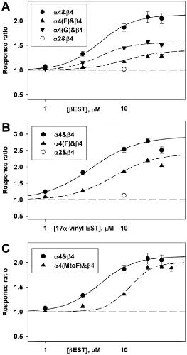 Fig 3. The effects of mutations on the concentration-effect relationship for potentiation.Data are shown for mutations of the tryptophan residue (WLAGMI; panels A and B) and the methionine residue (WLAGMI; panel C). ACh was applied at a concentration producing a response that produced a response of about 5 to 7% of maximal in the absence of steroid. The α subunit was expressed with β4 at an injection ratio of 20:1. The concentration-response relationship for potentiation was characterized by fitting a 3 parameter Hill equation to the ratios (Z[drug] = 1 + Zmax (1 / (1 + (EC50/[drug])^nHill), where Z is the response to a concentration of ACh in the presence of drug relative to that in the absence, Zmax is the maximal effect, EC50 is the concentration producing half-maximal potentiation, and nHill is the Hill coefficient. The fits did not include points that appeared to demonstrate block (e.g. data with 30 μM 17α-vinylestradiol). The data from each cell were fit separately, giving the following mean parameter estimates for βEST: α4: Zmax = 1.12 ± 0.12 (11 cells) and EC50 = 4.92 ± 0.48 μM; for α4(F): 0.41 ± 0.06 (3) P = 0.0002 and 10.43 ± 2.00 μM P = 0.4; for α4(G): 0.56 ± 0.03 (4) P = 0.001 and 4.90 ± 0.38 μM P = 0.98; and for α4(MtoF): 1.00 ± 0.03 (8) P = 0.34 and 11.76 ± 0.39 μM P < 0.0001, with values given as mean ± SE (number of cells) and significance of difference to α4 by t-test. The best-fitting estimates for 17α-vinylestradiol are: α4: 1.93 ± 0.06 (3) and 3.84 ± 0.27 μM and α4(F): 1.41 ± 0.08 (4) P = 0.004 and 7.32 ± 0.68 μM P = 0.010. The points show mean ± SE while the lines show the relationship predicted by the mean fit parameters.