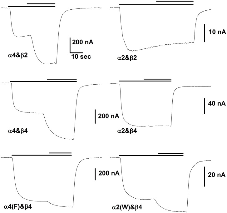Fig 1. Representative responses of oocytes injected with the indicated subunits.In each case the lower bar above the traces indicates the time of application of ACh while the upper bar shows the time of application of the same concentration of ACh plus 10 μM βEST. The concentration of ACh was chosen to produce a response of about 10% of maximal. The horizontal scale bar in the upper left panel shows 10 sec for all panels. For the trace obtained with α4&β2 the ACh concentration was 3 μM, for α4&β4 3 μM, for α4(F)&β4 3 μM, for α2&β2 10 μM, for α2&β4 20 μM and for α2(W)&β4 20 μM. For the figure the data were smoothed by averaging 10 points.