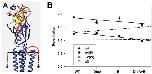 Fig 4. The effects of N-terminal chimeras on potentiation.Panel A shows a homology model of the α4 subunit (see Methods). A single subunit is shown, with the ion channel to the left and the extracellular solution at the top. The approximate location of the membrane is shown by the dashed box, note that the membrane spanning region is truncated in this view. The D to A loop region (MMT(57) to IVL(97)) is shown in red with amino acid side chains shown in stick representation, while the E loop (VTH(109) to QWT(124)) is shown in yellow. The carboxyl terminal region is shown in magenta and indicated by the red oval. In aligning the α4 subunit to sequence in the GluCl structure, the last amino acid in the structure aligned with the leucine in α4, so the AGMI residues are not shown. Note that the regions exchanged are far from the membrane and the C-terminal domain, but include portions of the ACh-binding site. Panel B shows potentiation for the different chimeras. The chimeric regions interchanged are indicated along the abscissa; chimeras were constructed on the α4 (filled triangles) and α4(F) (filled circles) subunits inserting sequence from the α2 subunit. Homologous transfers were made by transferring sequence from the α4 subunit into the α2 (hollow circles) and α2(W) (hollow triangles) subunits. The lines through the points for points show the lines predicted by linear regression on the source of the inserted region (see Methods). The slopes are -0.072 for chimeras on α4 and -0.095 on α4(F), and 0.008 for α2 and 0.066 for α2(W). None of the slopes differ significantly from 0 (P > 0.09). However, as shown in Table 5 in all cases the potentiation of receptors containing α4(DtoA+E) regions was significantly larger than those containing the homologous α subunits containing α2(DtoA+E) regions. Data values are given in Table 5.