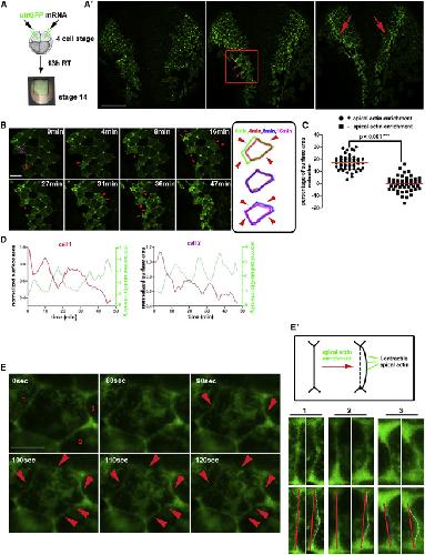 (B) Close up of region bound by red box in (Aʹ). Schematic shows the boundaries of an individual cell at different time points. Apical cell surface is reduced after apical actin enrichment events. Scale bar, 20 μm.
