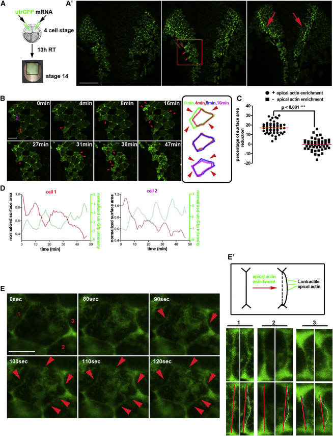 (E) High-resolution stills from a time-lapse sequence showing a cell with apical actin enrichment. Cell-cell boundaries are initially straight and are gradually displaced inward at different time points (red arrowheads). Scale bar, 10 μm. (Eʹ) Apical actin exerts forces on apical cell junctions, driving their displacement. High-magnification images of cell-cell junctions 1–3 from (E) at 0 s (left) and 120 s (right) are shown.