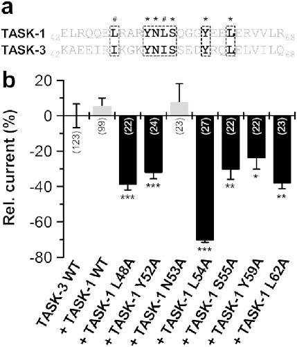 Figure 4. Co-expression of TASK-1 ‘hits’ from the alanine scan with TASK-3.(a) Sequence alignment of the tip of the TASK-1 and TASK-3 cap. TASK-1 ‘hits’ are highlighted in bold. *conserved residues; #conservative amino acids. (b) TASK-3 was injected in Xenopus oocytes alone (TASK-3 WT), in the presence of TASK-1 WT or in presence of TASK-1 mutants. Changes in current amplitudes compared to TASK-3 WT were analyzed at +40 mV. *p < 0.05; **p < 0.01; ***p < 0.001. Unpaired Student’s T-Test. Significance was probed against TASK-3 WT. Data are presented as Mean ± SEM. The number of experiments are included in the bar graphs.