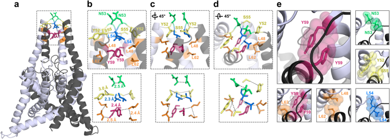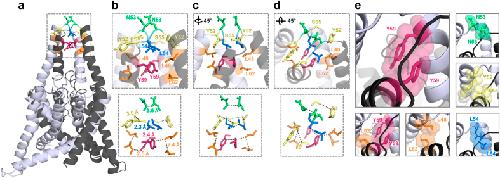 Figure 5. TASK-1 cap structure model based on domain-swapped TREK-2.TASK-1 cap structure illustrated after 100 ns of MD simulations. The two different subunits are shown in gray and light gray. TASK-1 cap model with the residues identified essential for channel expression, which are involved in intersubunit interactions. Pairs of residues that interact with each other are illustrated using the same color code. (a) Complete structure of the TASK-1 model. (b) Zoom-in to the boxed area of (a) illustrating interacting residues and their distances, and (c) after 45° rotation or (d) after additional tilting of 45° out of the plane. (e) Close-up in the cap on specific pairs of amino acids involved in intersubunit interactions.