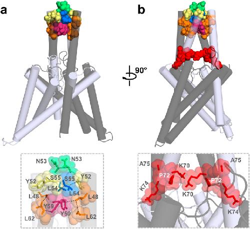 Figure 6. Hydrophobic interactions stabilize the tip of the TASK-1 cap structure.TASK-1 ‘hits’ identified in the alanine scan are highlighted in the TASK-1 homology model based on the domain-swapped TREK-2, following a 100 ns MD simulation. The two different subunits are shown in gray and light gray. (a) Residues stabilizing the tip of the cap structure are shown in space fill mode and a zoom-in is provided at the bottom. (b) 90° rotation of the model. Mutations resulting in a loss of ‘conductivity’ are illustrated in red space fill and a zoom-in showing these residues located in the EIP is provided at the bottom.