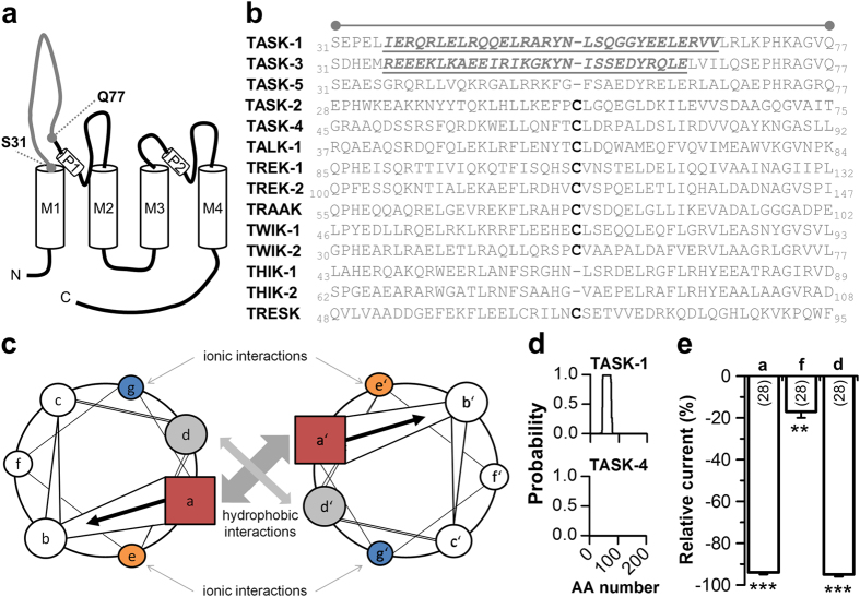 Figure 1. A coiled-coil prediction in the M1-P1 linker of TASK-1 channels.(a) Transmembrane topology of TASK-1. The extracellular region corresponding to the cap structure of other K2P channels is indicated. (b) Amino acid sequence alignment of different K2P channels for the extracellular region indicated in (a). The cysteine residues, conserved in most K2P channels, are highlighted in bold. Residues of the four heptad repeat coiled-coil predictions in TASK-1 and TASK-3 are indicated in italics and by underlining. (c) Coiled-coil structures usually contain a repeated pattern of hydrophobic (h) and charged (c) amino-acid residues. ‘hxxhcxc’ refers to a heptad repeat re-occuring after every two turns of the helix. The positions within the heptad repeat are commonly labeled as ‘a–g’, where ‘a’ (red) and ‘d’ (gray) are the hydrophobic core positions, often occupied by the amino acids isoleucine, leucine, or valine, thus stabilizing helix dimerization through hydrophobic and van-der-Waals interactions, whereas ‘e’ (orange) and ‘g’ (blue) are typically solvent-exposed, polar residues (e.g. glutamate or lysine) that give specificity between the two helices through interhelical electrostatic interactions. The remaining three positions (‘b’, ‘c’, and ‘f’, white) must be all hydrophilic, as these will form helical solvent exposed surfaces. (d) Coiled-coil prediction tools revealed with a high probability a four-fold coiled-coil repeat in TASK-1 (top), whereas for instance in TASK-4 no coiled-coil domain was predicted (bottom). AA, amino acid. (e) Typical interaction sites of coiled-coil domains were mutated and current amplitudes, analyzed at +40 mV, were compared to wild-type TASK-1. ‘a’, indicates the four-fold mutation of all a-sites (R38A/Q45A/Y52A/Y59A); ‘f’, indicates the four-fold mutation of all f-sites (L43A/A50V/G57A/R64A); ‘d’, indicates the four-fold mutation of all d-sites (L41A/L48A/S55A/L62A). **p < 0.01; ***p < 0.001. Unpaired Student’s T-Test. Data are presented as Mean ± SEM. The number of experiments are included in the bar graph.