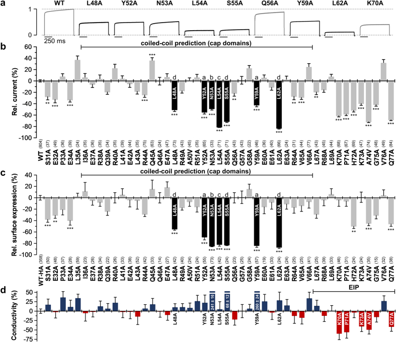 Figure 2. Alanine scan through the extracellular M1-P1 linker of human TASK-1 reveals hydrophobic residues relevant for functional surface expression.(a) Normalized representative current traces of wild-type and mutant TASK-1 channels recorded in Xenopus oocytes by a voltage step to +40 mV. (b) Relative current amplitudes at +40 mV compared to wild-type TASK-1 (WT). Mutants within the predicted coiled-coil domain exhibiting a pronounced current amplitude reduction are highlighted in black. (c) Relative surface expression analyzed with a chemiluminescence assay of wild-type TASK-1 with an extracellular HA epitope (WT-HA) and TASK-1 mutants introduced into the WT-HA background. Mutants within the predicted coiled-coil domain showing a strong reduction in relative surface expression are highlighted in black. (b,c) **p < 0.01; ***p < 0.001. Unpaired Student’s T-Test. Significance was probed against WT or WT-HA. Data are presented as Mean ± SEM. The number of experiments are indicated in parentheses above the construct name. (d) The ‘conductivity’ of TASK-1 mutants was calculated by dividing the relative change in current amplitudes of a mutant by the relative change in surface expression of the respective mutant. Red bars indicate a loss of channel gating, due to a reduced single-channel conductance or open probability (Po). Data are presented as Mean ± SEM.