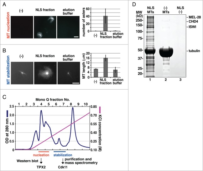 Figure 2. The pure NLS fraction is valuable to investigate the mechanisms of spindle assembly and function. (A) Microtubule (MT) nucleation induced by the NLS fraction. The Xenopus NLS fraction or elution buffer was concentrated ∼10 times and dialyzed to the dialysis buffer. The fractions were incubated in the depleted extract containing Cy3-labeld tubulin, and fixed on coverslips. Number of asters was counted in 10 randomly selected fields with 40x objective. Error bars, SD from 3 independent experiments. Scale bar, 20 μm. (B) MT stabilization induced by the NLS fraction. The concentrated, dialyzed fractions were incubated in the depleted extract containing centrosomes, Cy3-tubulin, and anti-TPX2 antibody that inhibits the MT nucleation shown in A. Samples were fixed, spun down on coverslips, and mounted. MT length of centrosomal asters was quantified.8 Error bars, SD from >20 asters. n > 3 experiments. Scale bar, 20 μm. (C) The Xenopus NLS fraction was applied to Mono Q column and eluted with the salt gradient. Each fraction was dialyzed and tested as in A, showing MT nucleation activity in fraction No. 4 and 5. Western blot showed the peak of TPX2 also in the No. 4 and 5. Each fraction was tested as in B, showing MT stabilization activity in fraction No. 6 and 7. Further purification of the activity and subsequent mass spectrometry identified Cdk11.8 (D) Microtubule-associated protein (MAP) preparation from the NLS fraction. The Xenopus NLS fraction was incubated with or without taxol-stabilized pure MTs. MAPs were eluted from the MTs with high salt (0.5 M NaCl), and were analyzed by SDS-PAGE and Coomassie staining. Mass spectrometry identified new spindle assembly factors (MEL-28 and CHD4) and maintenance factor (ISWI) in the first lane.