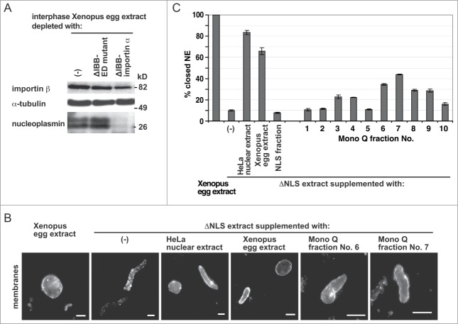 Figure 3. The NLS fractions promote NE formation. (A) Interphase Xenopus high-speed egg extracts were treated with ΔIBB-importin α or ΔIBB-ED mutant beads, and analyzed by Western blot. Nucleoplasmin (one of the most abundant NLS proteins in egg extracts) was depleted efficiently by ΔIBB-importin α but not by the ΔIBB-ED mutant. The levels of importin β and α-tubulin were unaffected. (−): no bead treatment. Note that we used ΔIBB-importin α to deplete NLS proteins but not importin β which is also important for NE assembly.30 (B) NE assembly is inhibited by the NLS depletion and is restored by addition of 1:10 volume of a rich source of importin α binding proteins (HeLa nuclear extracts, Xenopus high-speed egg extracts or the Mono Q Xenopus NLS fractions 6 and 7 (Fig. 2C)). Non-treated egg extracts were used as a control. Nuclei were analyzed by membrane staining (DiIC18). Scale bars, 10 μm. (C) Quantification of the inhibition and restoration of the NE formation. More than 100 randomly chosen chromatin substrates were measured for closed NE and normalized to the control. NE assembly is inhibited by the NLS depletion and is restored by addition of 1:10 volume of HeLa nuclear extracts and Xenopus high-speed egg extracts. The purified Xenopus NLS fraction did not restore the NE assembly probably because it is not enough concentrated. On the other hand, addition of the Mono Q fractions 6 and 7 significantly restored the NE assembly. Error bars represent SD from 3 different experiments.