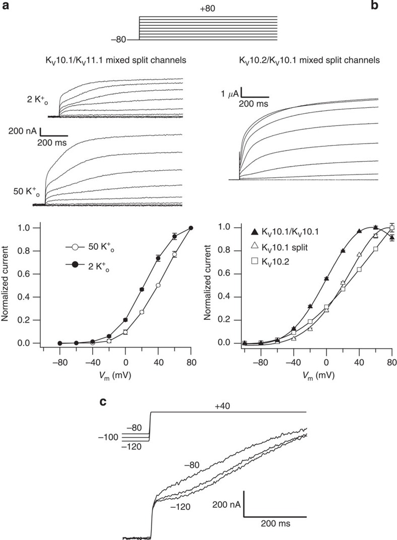 Voltage-dependent gating of KCNH potassium channels lacking a covalent link between voltage-sensing and pore domains.