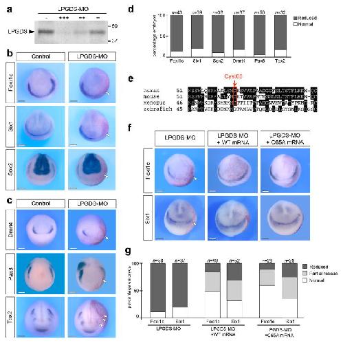 Figure 2. LPGDS is required for placode development(a) Increasing amounts of LPGDS-MO 10 ng (+), 100 ng (++), and 1000 ng (+++) blocks translation directed by LPGDS mRNA in an in vitro coupled transcription/translation reaction. The position of markers of known molecular weight (kDa) is indicated. (b) In situ hybridization for pan-placodal and (c) placode specific genes in control and LPGDS-MO injected embryos (frontal views, dorsal to top). Arrowheads indicate reduced expression on the injected side. (d) Quantification of the results. Four independent experiments were performed. The number of embryos analyzed (n) is indicated on the top of each bar. (e) Amino acid sequences alignment showing the conserved cysteine residue (Cyst65), center of LPGDS enzymatic activity. (f) Foxi1c and Six1 expression domains are rescued in LPGDS-MO-injected embryos by co-injection of either WT or C65A mouse LPGDS mRNA. Frontal views, dorsal to top; injected side is indicated by the lineage tracer (Red-Gal). (g) Quantification of the rescue experiment. Three independent experiments were performed. The number of embryos analyzed (n) is indicated on the top of each bar. LPGDS-MO vs. LPGDS-MO+WT or LPGDS-MO+C65A mRNA injected embryos (p<0.001, Fisher exact test.); LPGDS-MO+WT mRNA vs. LPGDS-MO+C65A mRNA injected embryos show no significant differences. Scale bars, 200 μm. |