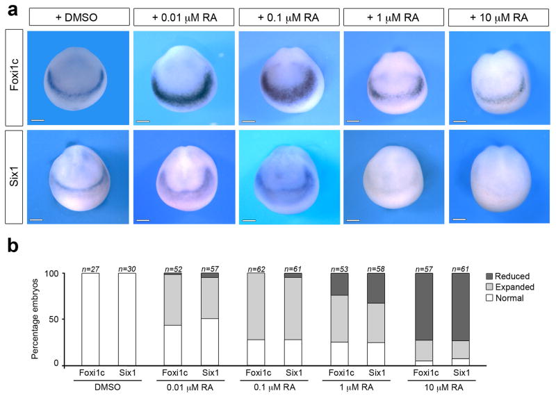 Figure 3. Retinoic acid affects PPR formation in a dose dependent manner(a) Treatment of intact embryos at stage 11 with increasing doses of RA (0.01 μM, 0.1 μM, 1 μM and 10 μM) disrupts Fox1ic and Six1 expression at the PPR. DMSO was used as a control. Frontal views, dorsal to top. (b) Quantification of the results. Four independent experiments were performed. The number of embryos analyzed for each condition (n) is indicated on the top of each bar. Scale bars, 200 μm. |