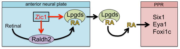 Figure 7. Model for the regulation of PPR formation by Zic1 and RA signalingZic1 controls RA signaling at the anterior neural plate through the activation of RALDH2 to produce RA, and LPGDS to transport RA extracellularly. As a consequence RA induces the expression of Six1, Eya1 and Foxi1c in neighboring cells (PPR). |