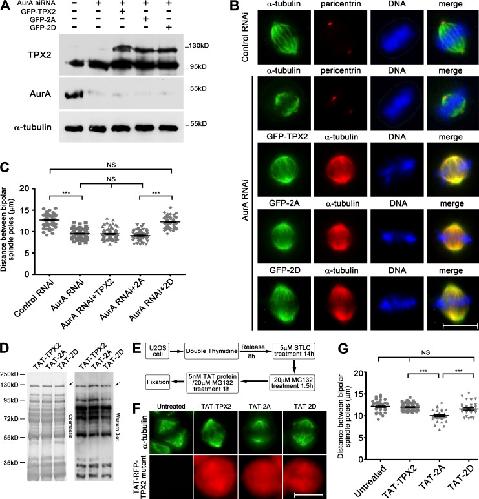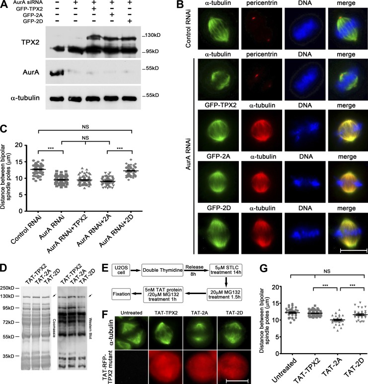 Figure 2. TPX2 phosphorylation rescues the short spindle defect caused by Aurora A depletion and specifically affects spindle length in metaphase. (A–C) HeLa cells were transfected with scrambled or Aurora A siRNA, or cotransfected with Aurora A siRNA and the indicated GFP-TPX2 constructs. Aurora A depletion causes short spindles, and TPX2-2D, but not -WT or -2A, could rescue such a defect. Bar, 10 µm. Three independent experiments were performed in C and n = 100, 94, 94, 60, and 88. Error bars indicate SEM. ***, P < 0.001. (D) His-TAT-RFP tagged TPX2-WT, -2A, and -2D purified from bacteria were visualized by Coomassie blue staining (left) and Western blotting with TPX2 antibody (right). The arrows indicate main bands of TPX2. (E–G) Cells treated with TAT-RFP-TPX2-2A show reduced length of metaphase spindles compared with normal structures in untreated, WT, or 2D-treated cells. Bar, 10 µm. n = 34, 76, 34, and 32. Error bars indicate SEM.
