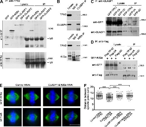 Figure 4. TPX2 interacts with CLASP1 in a phospho-dependent manner, and its function in scaling spindle is bypassed by codepletion of CLASP1 and Kif2a. (A) Mitotic HeLa cells transfected with the indicated constructs were immunoprecipitated with TPX2 antibody. Kif2a and CLASP1 form complexes with TPX2, whereas CLASP2 and GFP could not. (B) Mitotic HeLa lysates were immunoprecipitated with IgG, CLASP1, or Kif2a antibody. CLASP1 and Kif2a specifically bind to TPX2. The asterisk indicates Kif2a. (C) Mitotic cells transfected with GFP-tagged TPX2 constructs were immunoprecipitated with CLASP1 antibody. TPX2-2A binds significantly less CLASP1 than -WT and -2D. (D) Mitotic cells cotransfected with GFP-Kif2a and Flag-tagged TPX2 constructs were immunoprecipitated with flag antibody. TPX2, 2A, and 2D show similar affinity to Kif2a. (E and F) HeLa cells co-depleted of CLASP1/Kif2a were transfected with GFP-TPX2 or -2A. In mock-depleted cells, overexpression of TPX2-2A causes short spindles whereas in CLASP1/Kif2a-depleted cells, it does not affect the spindle length. Bar, 10 µm. n = 81, 89, 73, and 86. Error bars indicate SEM. ***, P < 0.001.