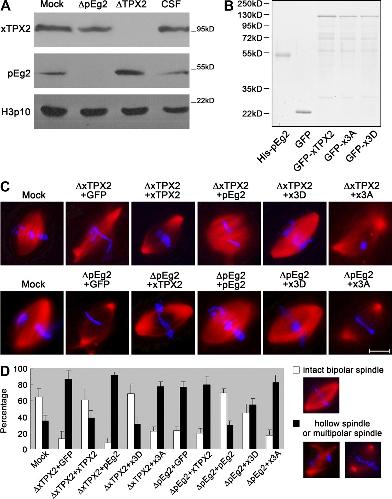 Figure 5. TPX2 phosphorylation by Aurora A is required for intact bipolar spindle assembly in mitotic Xenopus egg extract. (A) Mitotic extracts (CSF) depleted of pEg2 (Aurora A) or xTPX2 were subjected to Western blotting. Histone H3 Serine10 phosphorylation serves as a mitotic marker. (B) Coomassie blue staining showing the recombinant proteins added in C. (C and D) CSF depleted of xTPX2 or pEg2 was added with indicated proteins. Sperm-induced bipolar spindle formation was impaired by xTPX2 or pEg2 depletion. Among all proteins to rescue such defects, GFP-xTPX2-3D showed the best effect, whereas GFP and GFP-xTPX2-3A showed no rescue. GFP-xTPX2 could partially rescue xTPX2 but not pEg2 depletion; His-pEg2 could rescue pEg2 but not xTPX2 depletion. Bar, 20 µm. Three independent experiments were performed in D, each measuring 100 spindles. Error bars indicate SD.