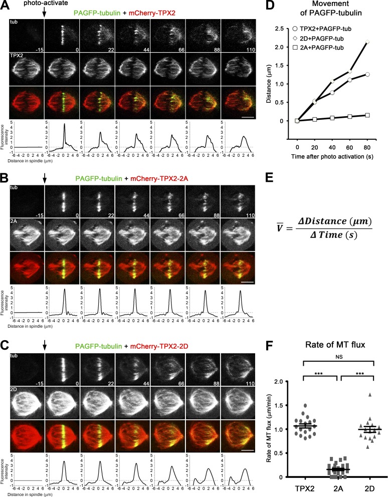 Figure 3. Phospho-null TPX2 inhibits MT flux on metaphase spindles. (A–D) U2OS cells were cotransfected with photoactivatable GFP-tagged α-tubulin (PAGFP-tubulin) and mCherry-TPX2, -2A, or -2D. GFP signal in a rectangular region near the MT plus ends was activated (time point 0, arrows) and tracked every 15 s. Representative time-course images are shown in A–C and fluorescence intensity profiles are plotted at the bottom. Bars, 5 µm. The x coordinate of the maximum intensity from each frame (≥ time 0) is shown in D. (E and F) The mean velocity of MT flux is defined by the ratio between distance relative to the equator and time. n in F: 18, 25, and 16. Error bars indicate SEM. ***, P < 0.001.