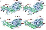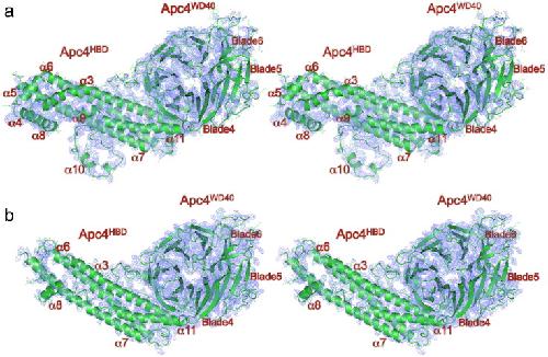 Fig. 3. Comparison of EM density maps of APC/CCdh1.Emi1 and crystal structure 2Fo − Fc maps of human Apc4. (a) Stereoview of the EM density map and Apc4 coordinates. Main chain is shown as a cartoon. (b) Stereoview of the 2Fo − Fc density map contoured at 1σ and Apc4 coordinates. Main chain is shown as a cartoon.