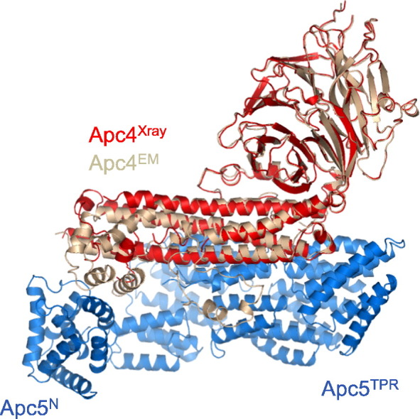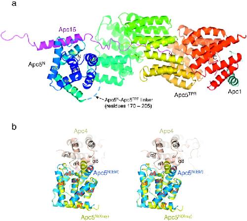 Fig. 6. Apc5 has an N-terminal helical domain (Apc5N) connected by a disordered linker to a TPR superhelix of 13 TPR motifs (Apc5TPR). (a) Cartoon of EM structure of human Apc5 color-ramped from blue to red from N- to C-termini. The small subunit Apc15 that contacts Apc5 is also shown. (b) Stereoview of a superimposition of Apc5N based on human Apc5N EM coordinates (blue) and Xenopus Apc5N X-ray (yellow) coordinates. Major structural differences involve the α1/α2 and α5/α6 loops that contact Apc4.