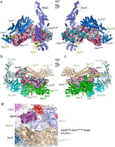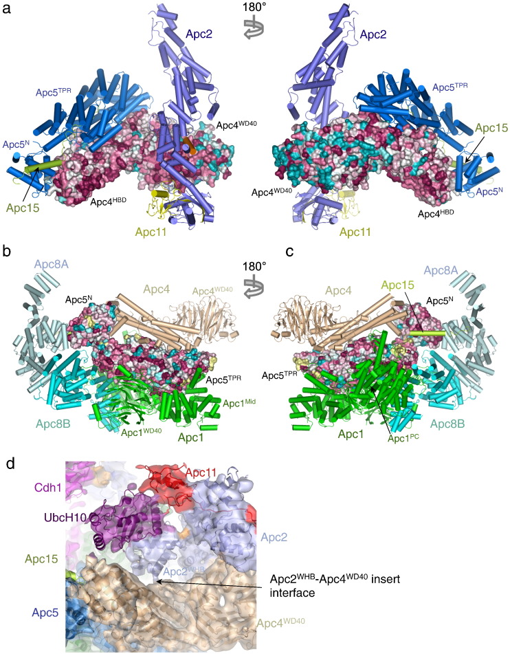 Fig. 7. Apc4 and Apc5 interact with neighboring subunits through evolutionarily conserved protein–protein interfaces. (a) Surface of Apc4 color-coded according to conservation (purple, conserved; cyan, unconserved). Contacting subunits Apc2, Apc5 and Apc15 are shown as cartoons. (b and c) Surface of Apc5 color-coded according to conservation (purple, conserved; cyan, unconserved). Contacting subunits Apc1, Apc4, Apc8 and Apc15 are shown as cartoons. (d) Cryo-EM density map of the APC/CCdh1.Hsl1–UbcH10 complex, color-coded according to subunit assignments [44]. Density connects Apc2WHB with the blade 3 insert of Apc4WD40, suggesting a direct interaction between these domains. EM coordinates are shown.