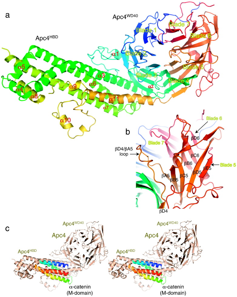 Fig. 1. Apc4 comprises a WD40 β-propeller toroid split by a helical bundle domain. (a) Cartoon of Apc4 color-ramped from blue to red from N- to C-termini. Shown is the EM structure of human Apc4. (b) Close-up view of the extended blade 5 of Apc4WD40 and showing the βD4/βA5 loop that blocks access to the mouth of the WD40 domain tunnel. (c) Stereoview showing that the M-domain of α-catenin, superimposed onto the EM structure of human Apc4HBD, shares structural similarity with the four-helical-bundle domain of Apc4.