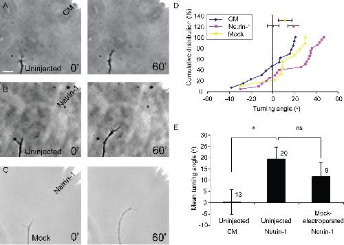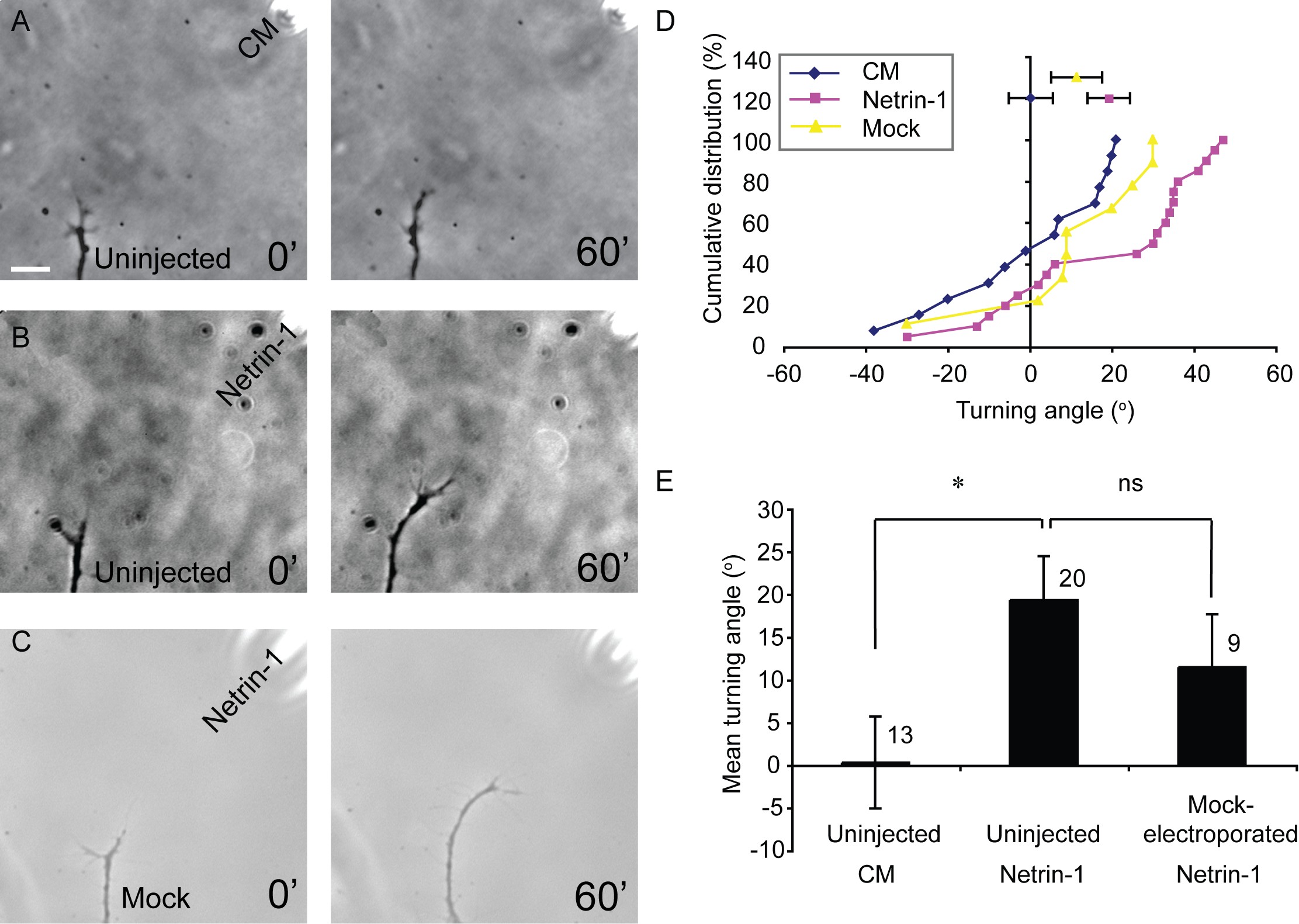 S3 Fig. Cultured retinal neurites exhibit chemoattraction to Netrin-1. (A-C) Phase contrast images of retinal neurites from uninjected (A, B) and mock electroporated (C) retinae exposed to either a culture medium control (CM; A) or netrin-1 (B, C). (D) Cumulative distributions of turning angles of each sample group. (E) Mean turning angles of the experimental groups reveals that, whereas uninjected neurites exposed to CM did not exhibit any turning bias, neurites exposed to Netrin-1 were attracted to this guidance cue. * p < 0.05, Kolmogorov-Smirnov test. Scale bar in A: 10 μm. https://doi.org/10.1371/journal.pone.0141290.s003 (TIF) |