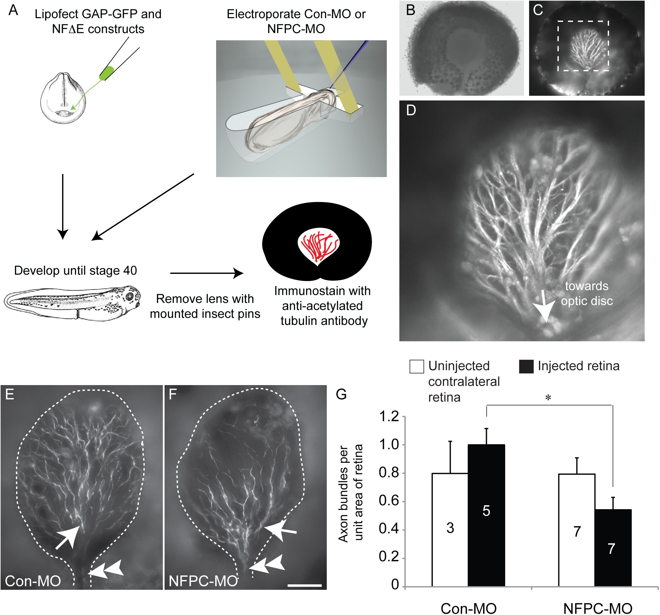 Fig 1. Electroporation of NFPC morpholinos disrupts RGC axon outgrowth in vivo. (A-D) A method for investigating intraretinal guidance. (A) RGCs were lipofected with either GAP-GFP or NFδE constructs at stage 19, or electroporated with control (Con-MO) or NFPC morpholinos (NFPC-MO) at stage 24. Embryos were then allowed to develop until stage 40, at which time eyes were dissected from the embryo. After removal of the lens, immunostaining for acetylated α-tubulin was performed to mark retinal axons. (B) Brightfield image of an uninjected eye with lens removed. (C) Fluorescence labelling of the same eye as in B, revealing expression of acetylated α-tubulin in retinal axons. (D) Magnified view of the boxed region in C, showing immunolabelled retinal axons coursing towards the optic disc. (E, F) Acetylated α-tubulin staining in a retina loaded with the Con-MO (E) and a retina loaded with the NFPC-MO (F). In all cases analyzed regions of interest are delineated by dashed lines. Immunostaining reveals that in all cases RGC axon bundles (arrows in E and F) form and are oriented towards the optic disc (double arrowheads in E and F). However, quantification of the number of RGC axon bundles per unit area of the retina (G) reveals significantly reduced number of axon bundles in NFPC-MO-loaded retinae in comparison to Con-MO-loaded eyes. Values were normalized against the Con-MO group and the number of retinae analysed are presented within the bars. * p <0.05, Kruskal-Wallis test. Scale bar in F: 75 μm (B, C), 30 μm (D), 40 μm (E, F). https://doi.org/10.1371/journal.pone.0141290.g001 |