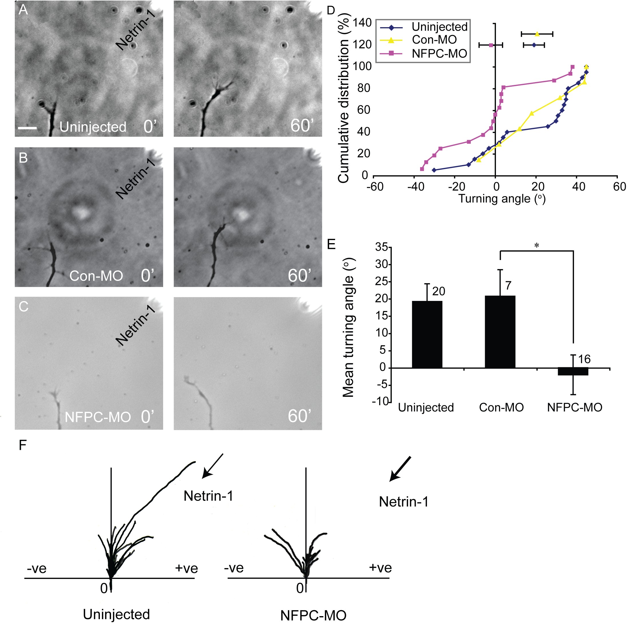 Fig 2. Cultured retinal growth cones loaded with NFPC morpholino do not exhibit chemoattraction to Netrin-1. (A-C) Phase contrast images of retinal neurites cultured from uninjected (A), control morpholino-loaded (Con-MO; B) and NFPC morpholino-loaded (NFPC-MO; C) retinae. Neurites from uninjected (A) and Con-MO-loaded (B) retinae exhibit robust turning towards the point source of Netrin-1. Neurites loaded with the NFPC-MO, however, are not attracted towards Netrin-1 (C). (D) Cumulative distributions of turning angles of each sample group. (E) Mean turning angles of the experimental groups reveals that, whereas uninjected and Con-MO-loaded neurites exhibit attraction to Netrin-1, NFPC-MO-loaded neurites do not. * p < 0.05, Kolmogorov-Smirnov test. Panel F shows a summary of the trajectory plots from the uninjected and NFPC-MO experimental groups exposed to Netrin-1. Each line represents a single growth cone trajectory; the origin represents the centre of the growth cone at 0 min, and positive (+ve) and negative (-ve) turning angles are indicated. Scale bar in A: 10 μm. https://doi.org/10.1371/journal.pone.0141290.g002 |