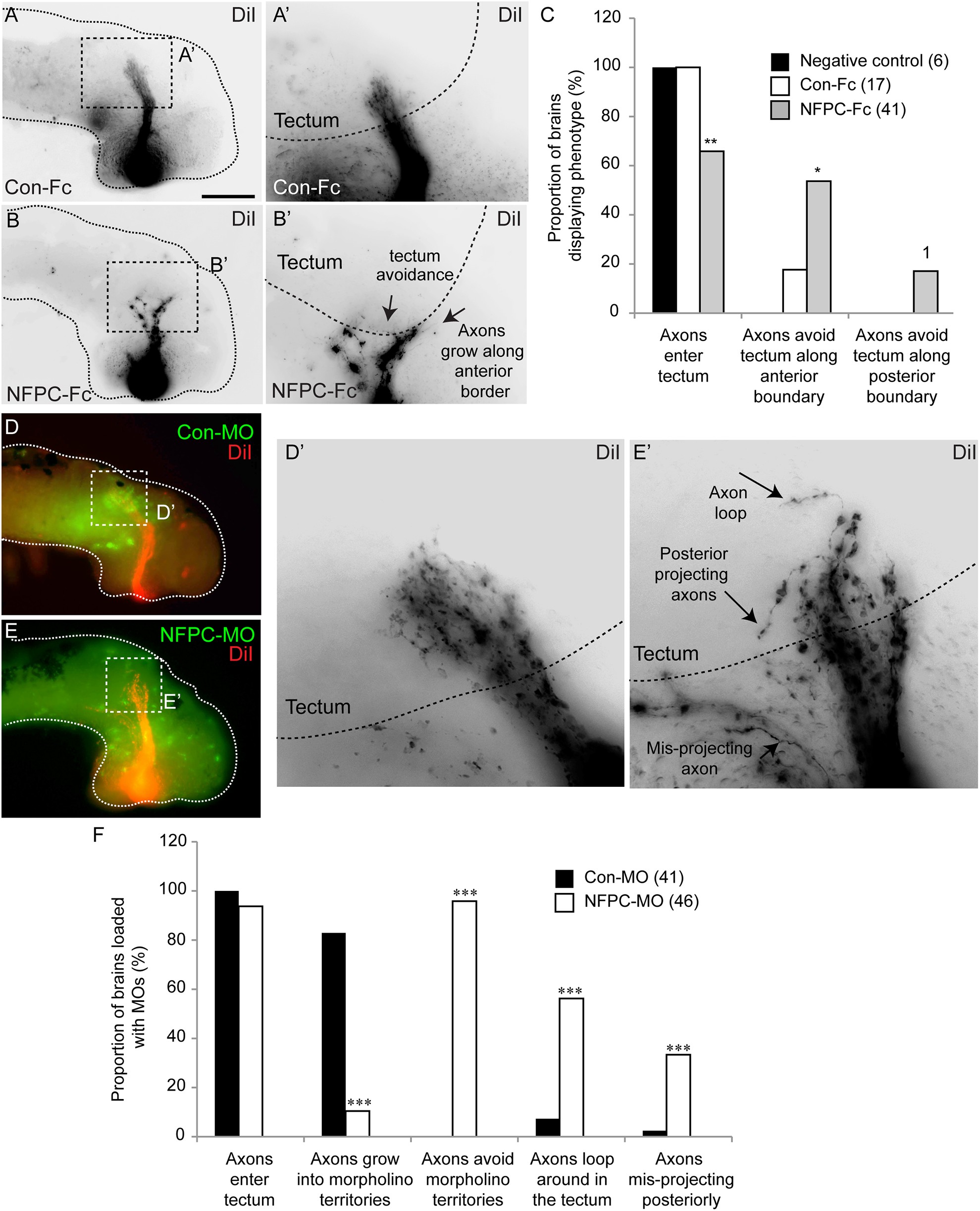 Fig 4. Perturbation of NFPC binding leads to tectum entry defects. Open brain embryos were incubated with Con-Fc (A) or NFPC-Fc (B) from stage 35. At stage 40, retinal axons were labelled with DiI. Brains were then dissected and mounted in the contralateral view to enable visualization of the optic tract. Inverse greyscale images show that the axon bundle trajectories of Con-Fc-treated brains appeared normal (A, higher magnification shown in Aâ), with RGC axons entering the tectum normally (the tectum is delineated with a dashed line in Aâ). Brains treated with the NFPC-Fc ectodomain construct (B), however, exhibit various phenotypes including axons avoiding the tectum and growing along the anterior tectal boundary (Bâ). (C) Graph showing the proportion of brains incubated with the NFPC-Fc peptide that display axons avoiding either the anterior or posterior boundary of the tectum. Statistical significance was calculated against the Con-Fc proportions. * p<0.05, ** p<0.01, 1p = 0.0934, Fisherâs exact test (6 independent experiments). Brains electroporated with the Con-MO within the optic tectum (D) do not exhibit defects in axon pathfinding, as RGC axons grew through the electroporated region into the tectum (Dâ is an inverse greyscale image showing the trajectory of DiI-filled RGC axons). Panel E shows a representative image of a brain electroporated with the NFPC-MO within the tectum. Perturbation of NFPC binding culminated in phenotypes including looping and projection along the posterior tectal boundary (Eâ is an inverse greyscale image showing the trajectory of DiI-filled RGC axons). Panel F reveals the proportion of brains loaded with the NFPC-MO that exhibit abnormal projections into the tectum. Statistical significance was calculated against Con-MO proportions. *** p<0.001, Fisherâs exact test (7 independent experiments). Scale bar in A: 300 μm (A, B, D, E), 75 μm (Aâ, Bâ), 50 μm (Dâ, Eâ). https://doi.org/10.1371/journal.pone.0141290.g004 |