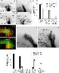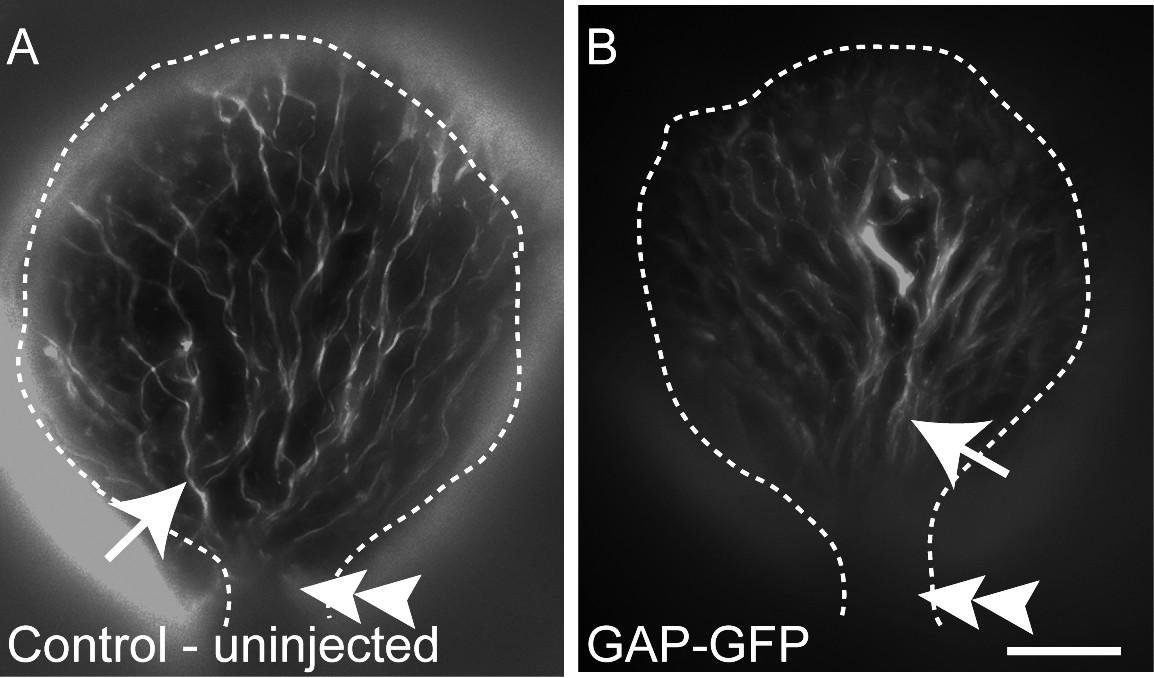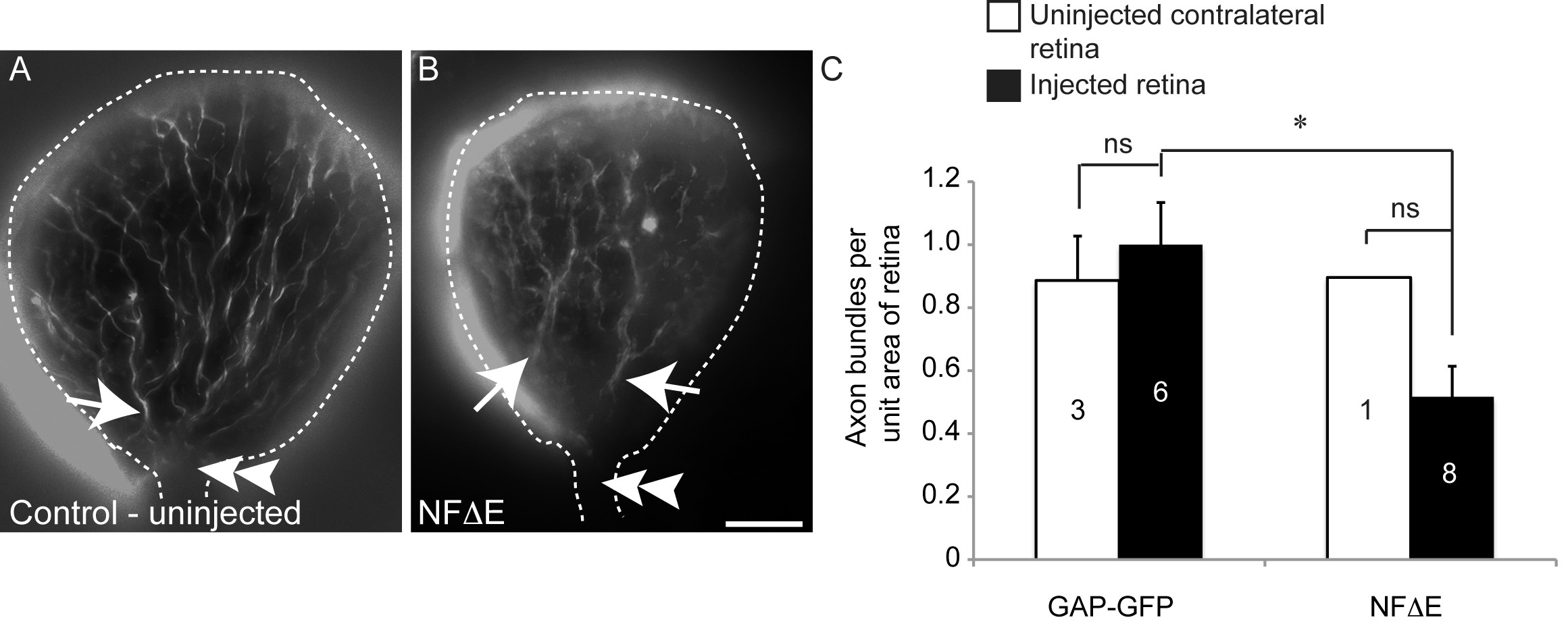 (A) An example of an uninjected eye. Immunostaining with acetylated α-tubulin (red) revealed a normal pattern of axon outgrowth (arrow) that converged on the optic disc (double arrowhead) to exit the eye. (B) Lipofection with a GAP-GFP construct did not affect the number or the directionality of axon bundles (arrow) converging on the optic disc (double arrowhead). Exposed retinae are marked by dashed white lines. Scale bar in B: 30 μm. |