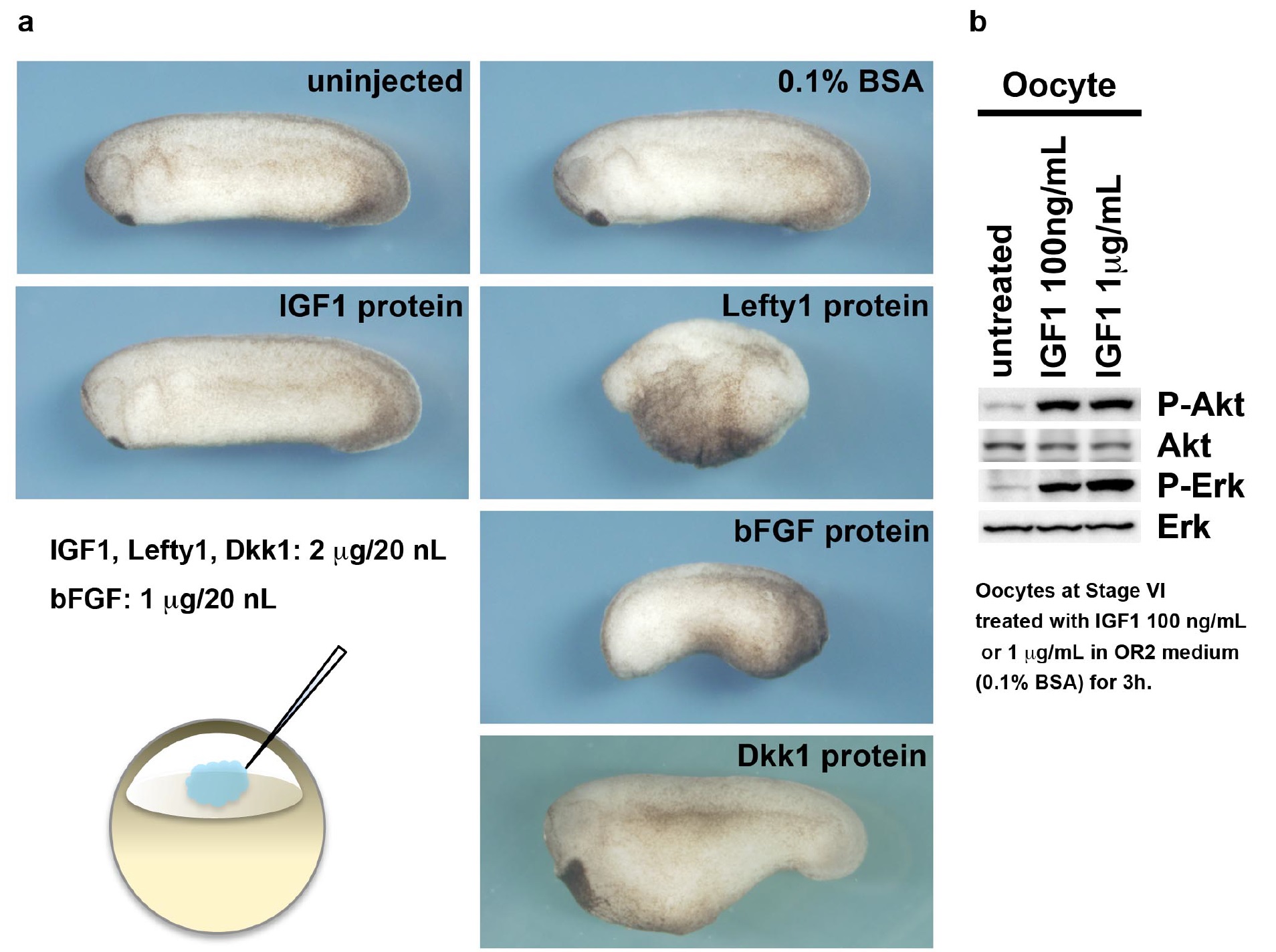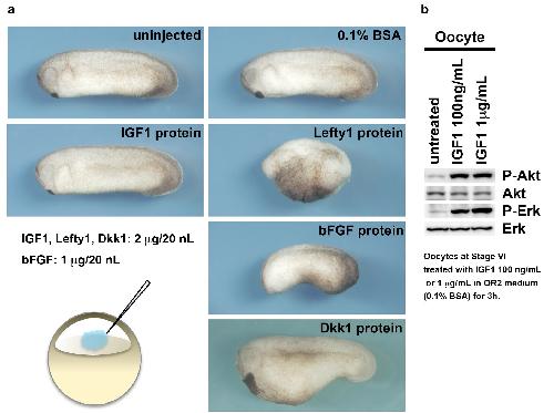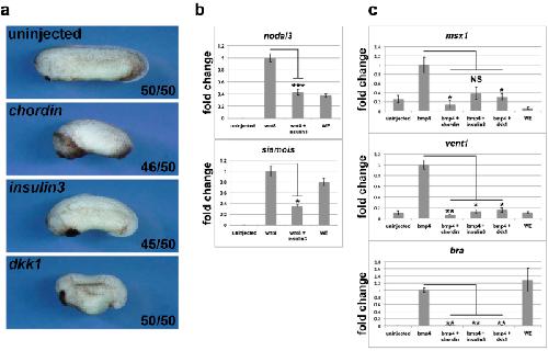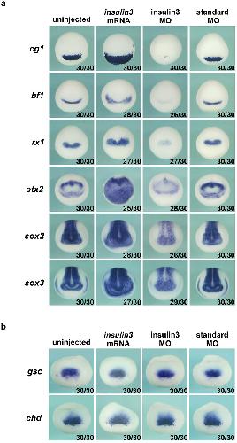 Genes referenced: bmp4 chrd dkk1 epb41l4b fgf2 fgf4 foxg1 fzd8 gsc igf1 igf1r igf2 igf3 ins insl5 lefty1 lrp6 mapk1 msx1 myc odc1 otx2 rax sia1 sox2 sox3 tbxt ventx1.2 wnt3a wnt8a