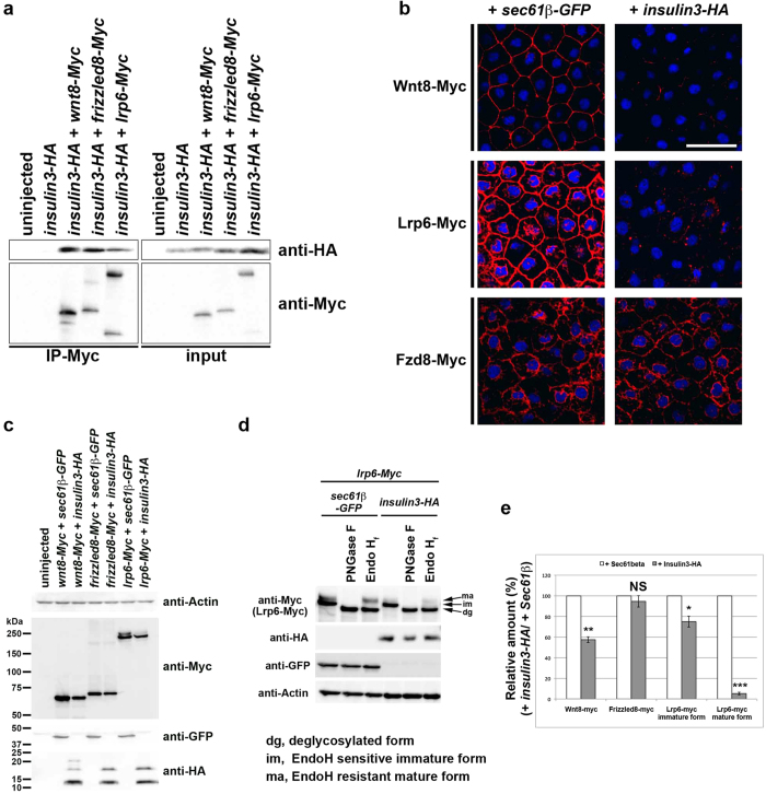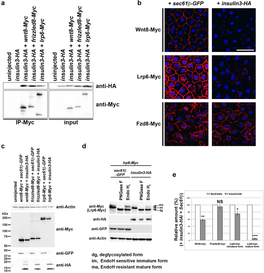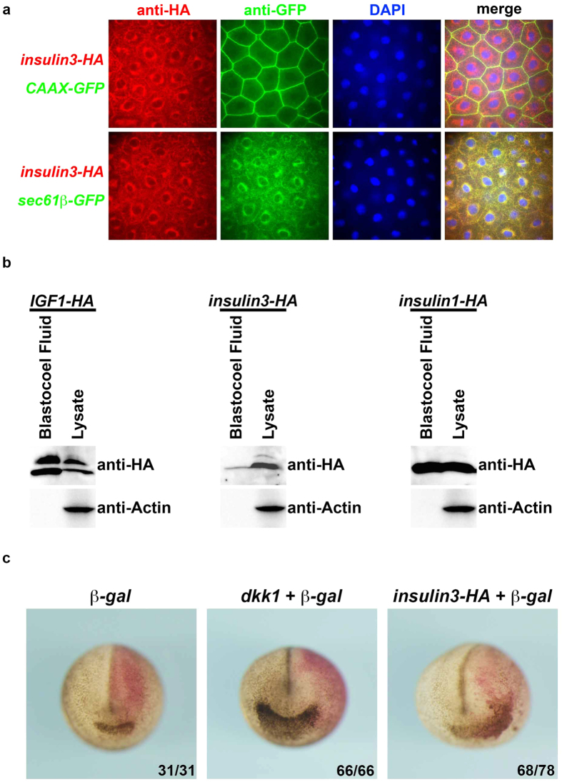 Insulin receptor (IR) and insulin-like growth factor-1 receptor (IGF1R) signalling is required for normal embryonic growth and development. Previous reports indicated that the IGF/IGF1R/MAPK pathway contributes to neural induction and the IGF/IGF1R/PI3K/Akt pathway to eye development. Here, we report the isolation of insulin3 encoding a novel insulin-like ligand involved in neural induction. Insulin3 has a similar structure to pro-insulin and mature IGF ligands, but cannot activate the IGF1 receptor. However, similar to IGFs, Insulin3 induced the gene expression of an anterior neural marker, otx2, and enlarged anterior head structures by inhibiting Wnt signalling. Insulin3 are predominantly localised to the endoplasmic reticulum when otx2 is induced by insulin3. Insulin3 reduced extracellular Wnts and cell surface localised Lrp6. These results suggest that Insulin3 is a novel cell-autonomous inhibitor of Wnt signalling. This study provides the first evidence that an insulin-like factor regulates neural induction through an IGF1R-independent mechanism.