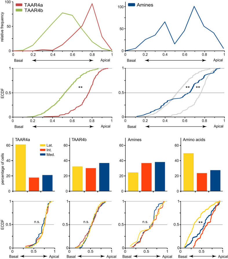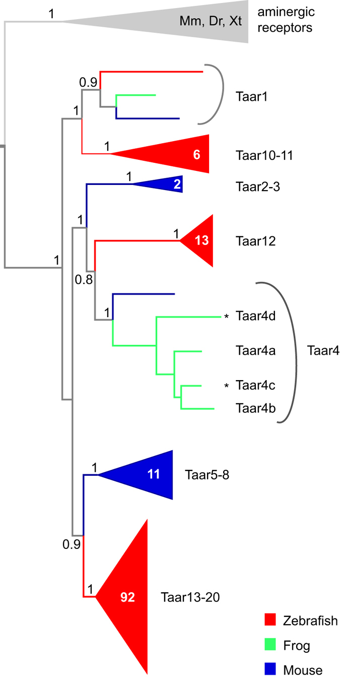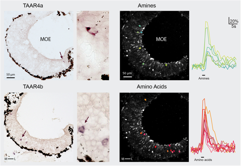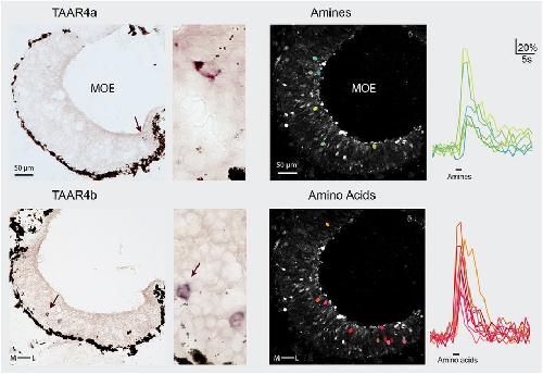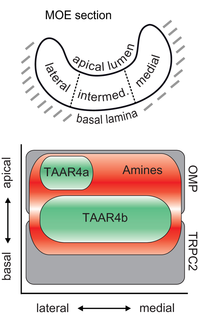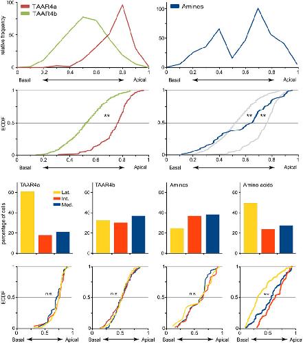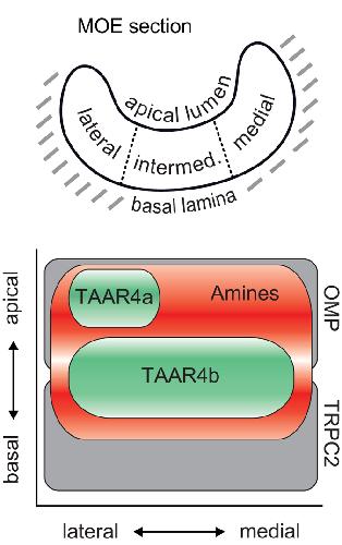 Different expression domains for two closely related amphibian TAARs generate a bimodal distribution similar to neuronal responses to amine odors.